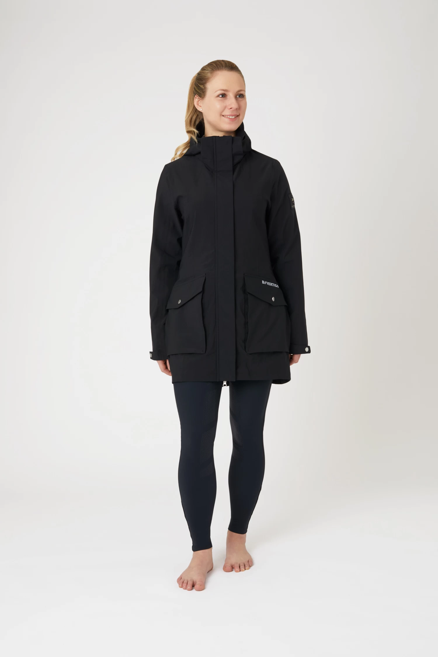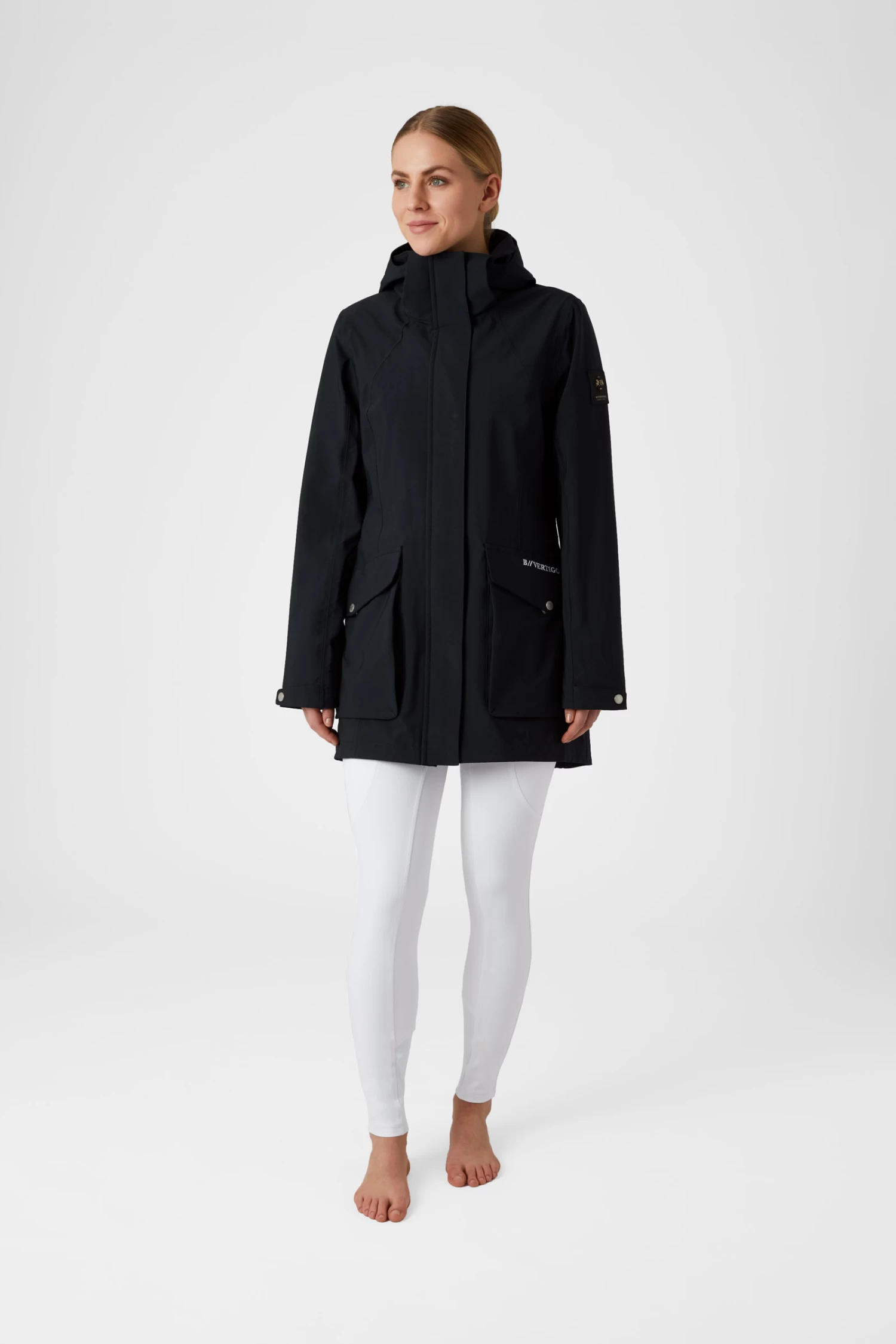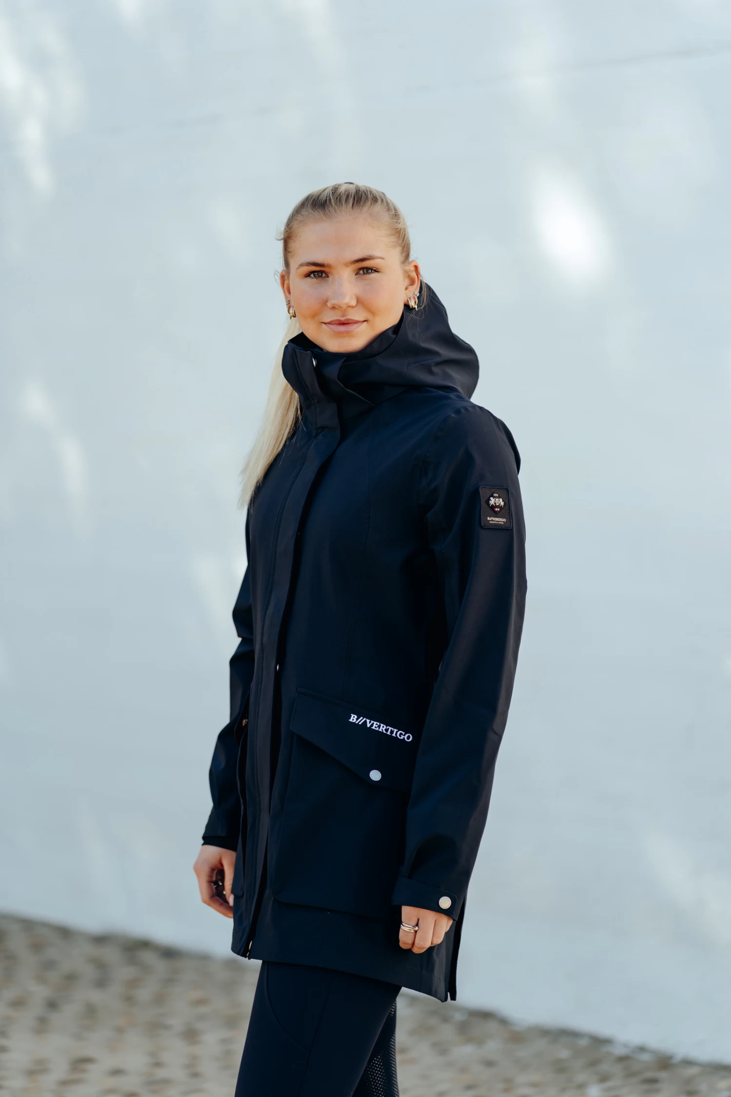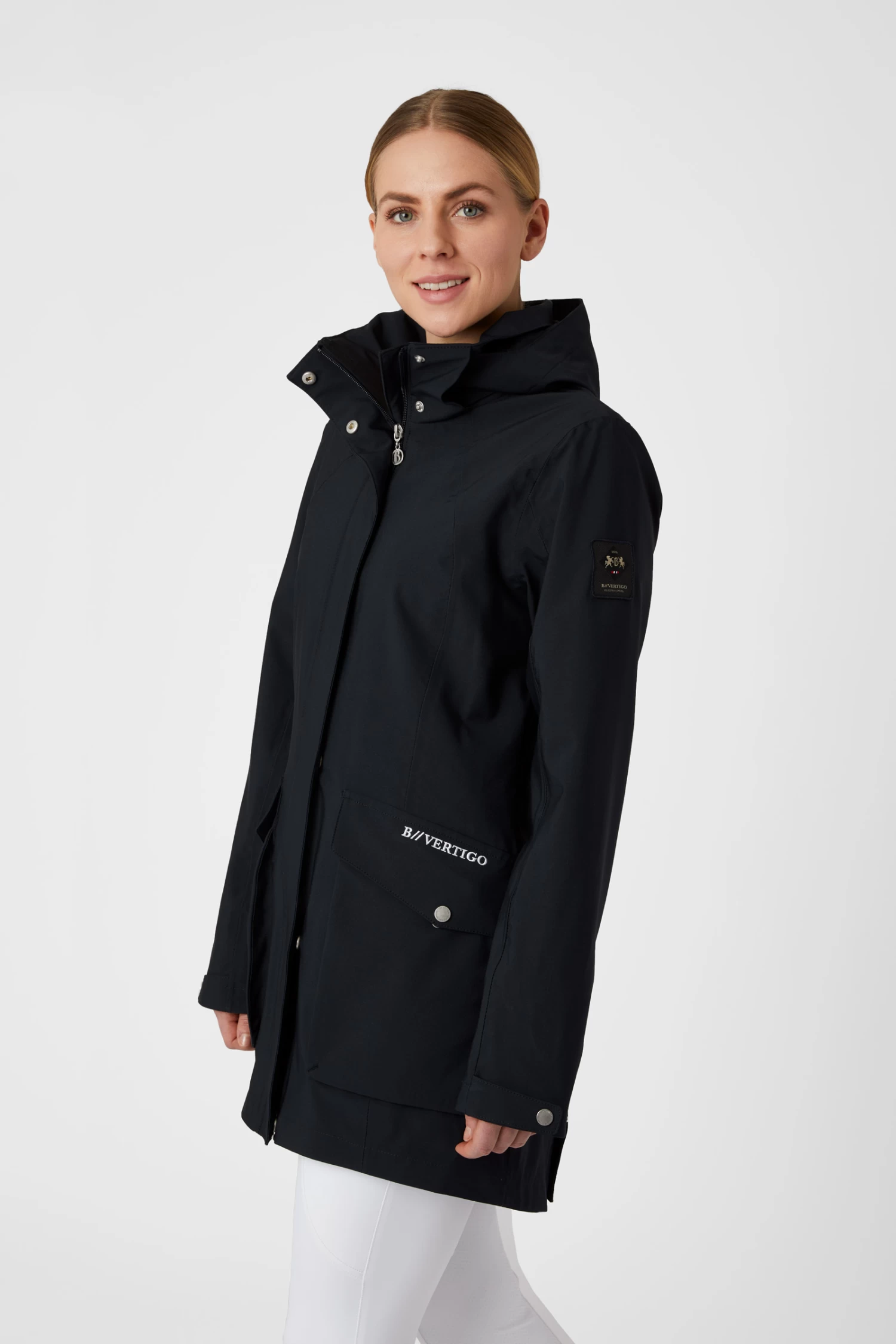 The B Vertigo Caroline waterproof jacket perfectly protects you from rain and wind. The long cut adds warmth without restricting your movement or damaging the saddle due to two back slits with magnetic buttons that open up widely. Big pockets with zippers and press buttons keep your belongings safe. The hood can be easily detached with a zipper. Elastic cuffs inside the sleeves are extra comfortable and waterproof. Elastic draw string at the waist adds a flattering shape. Pair it with our B Vertigo Caroline fleece vest for extra warmth.