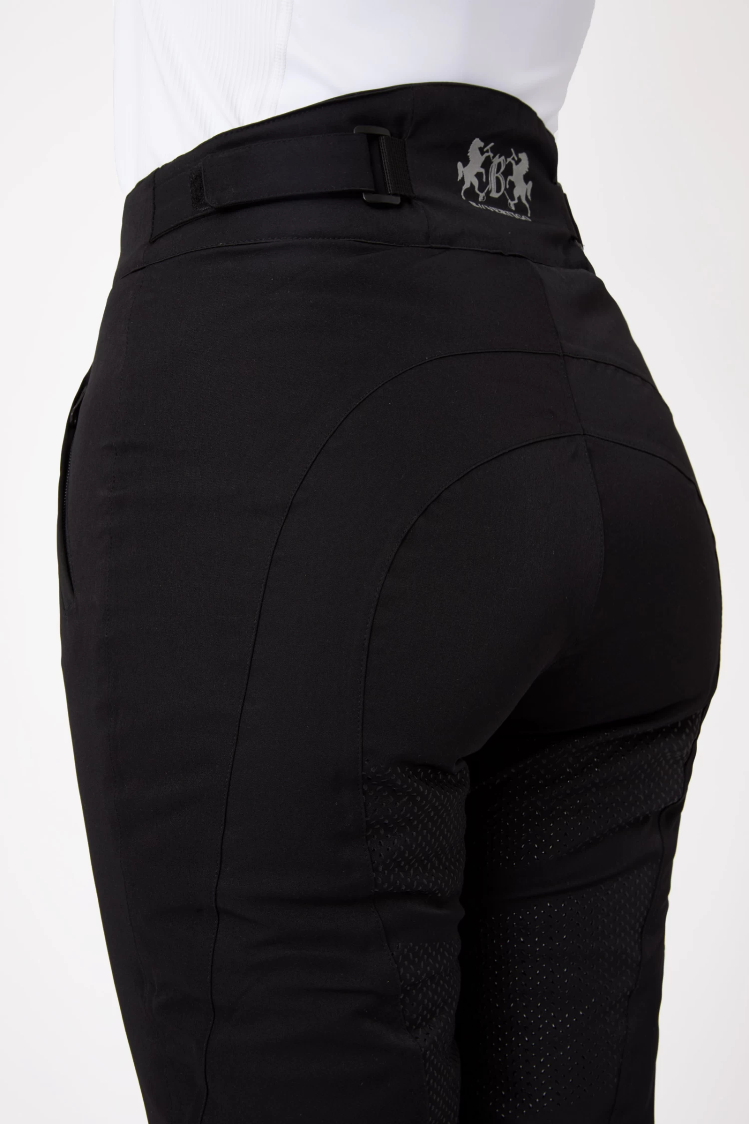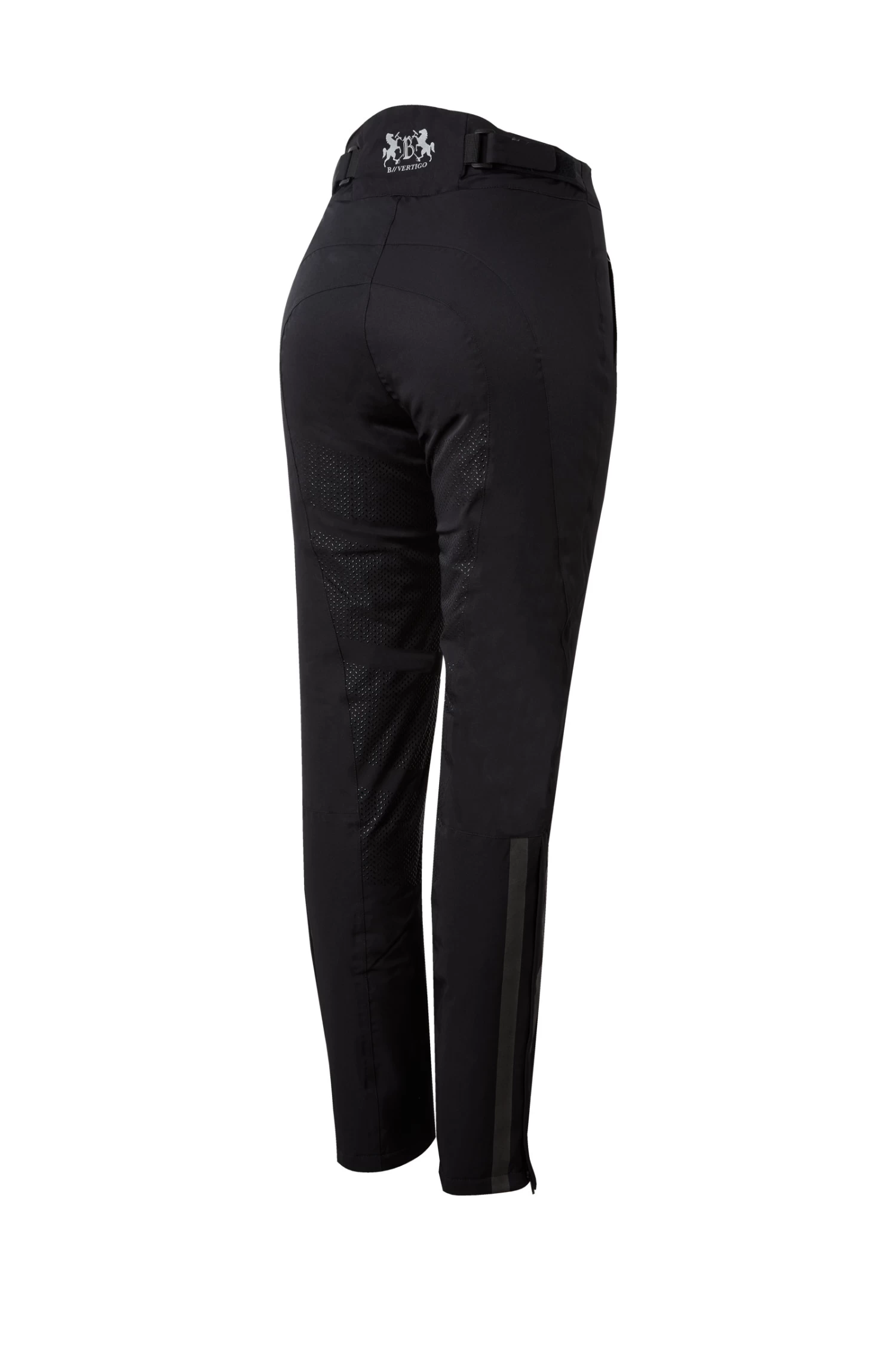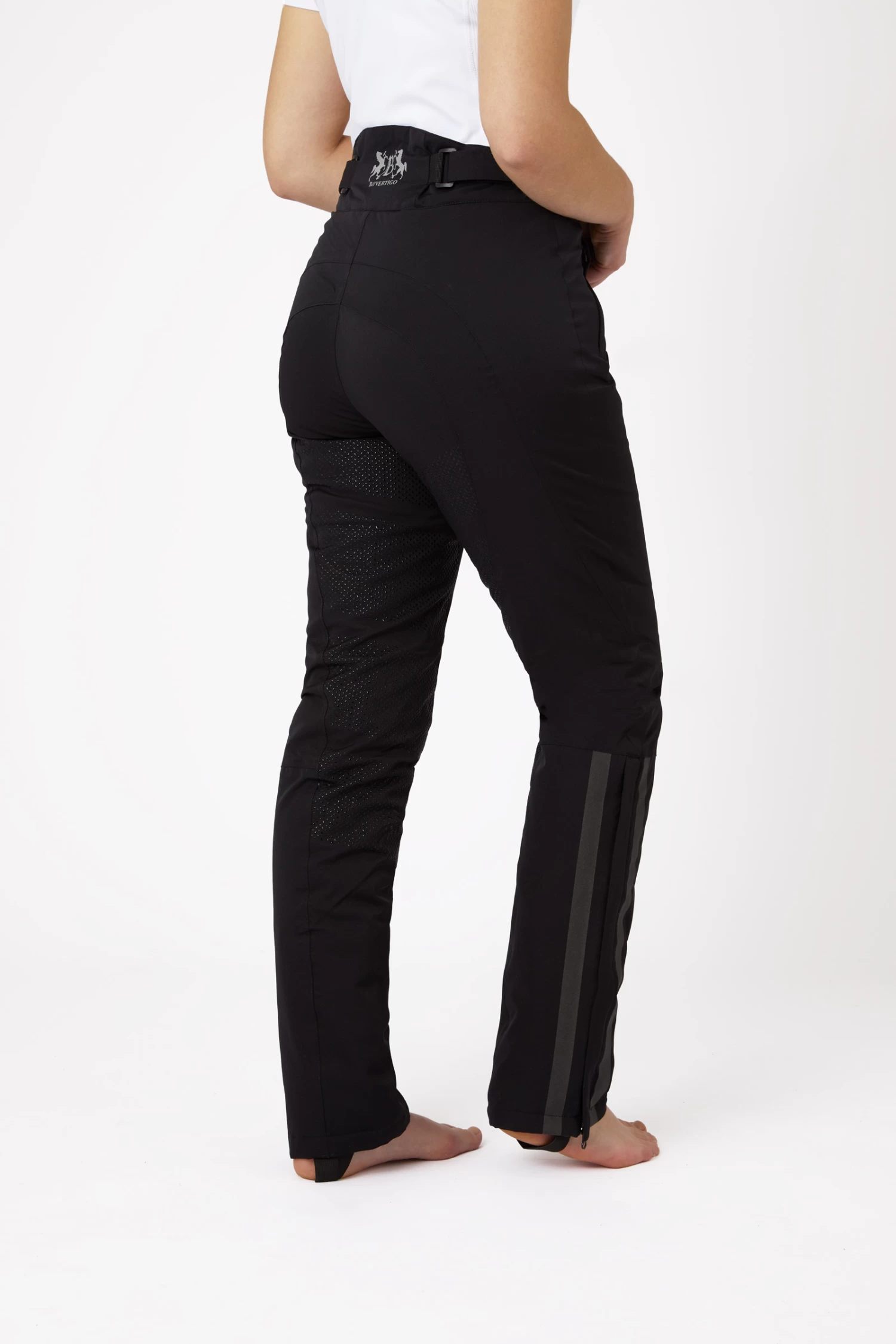 Numerous practical features on the Dana breeches make them the ultimate winter breeches. The adjustable waist with hook-and-loop straps and detachable elasticated leg straps allow you to tailor these breeches to your needs. The padded fabric is comfortable and provides much needed warmth for chilly days – it’s also waterproof, windproof and breathable, allowing you to take on all the elements. It’s stretchy too for a great fit and comfort when riding. Technical silicone print at the seat and a high waist provides perfect shape and support in the saddle. Front zipper pockets are perfect for storing keys or carrots. Stylish B Vertigo is a great finishing touch to these high quality winter breeches.