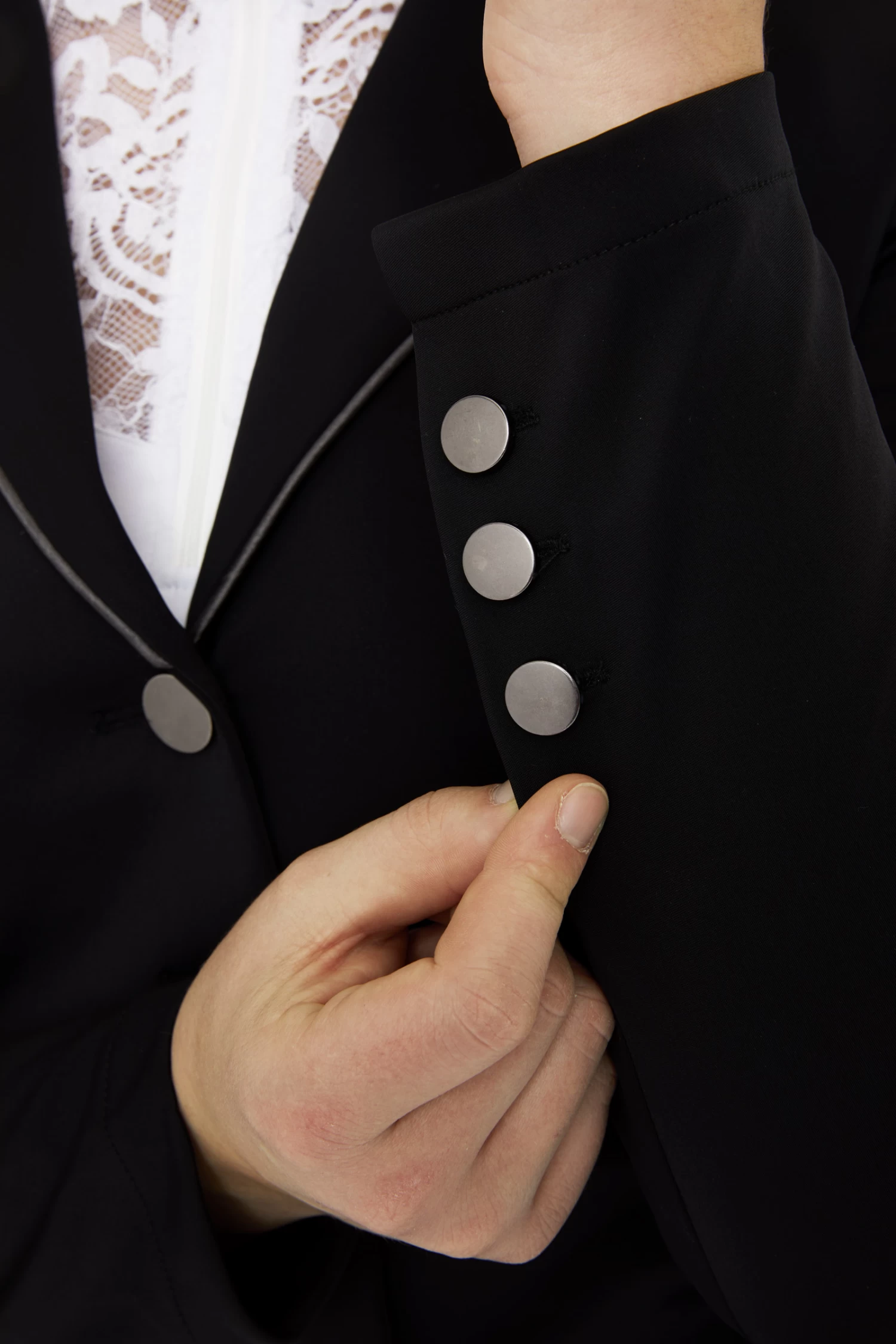 Elegant details and a lightweight fabric give this classy show jacket its elegant look and feel. The careful attention to detail and quality workmanship make this jacket special. The soft fabric with extremely breathable mesh lining will keep you comfortable all day long thanks to the quick-dry function. A metallic silver-coloured piping along the collar and pockets make this show jacket look classy. The front welt pockets and back slits together with the shiny gun metal embroidery provide a stunning appearance.