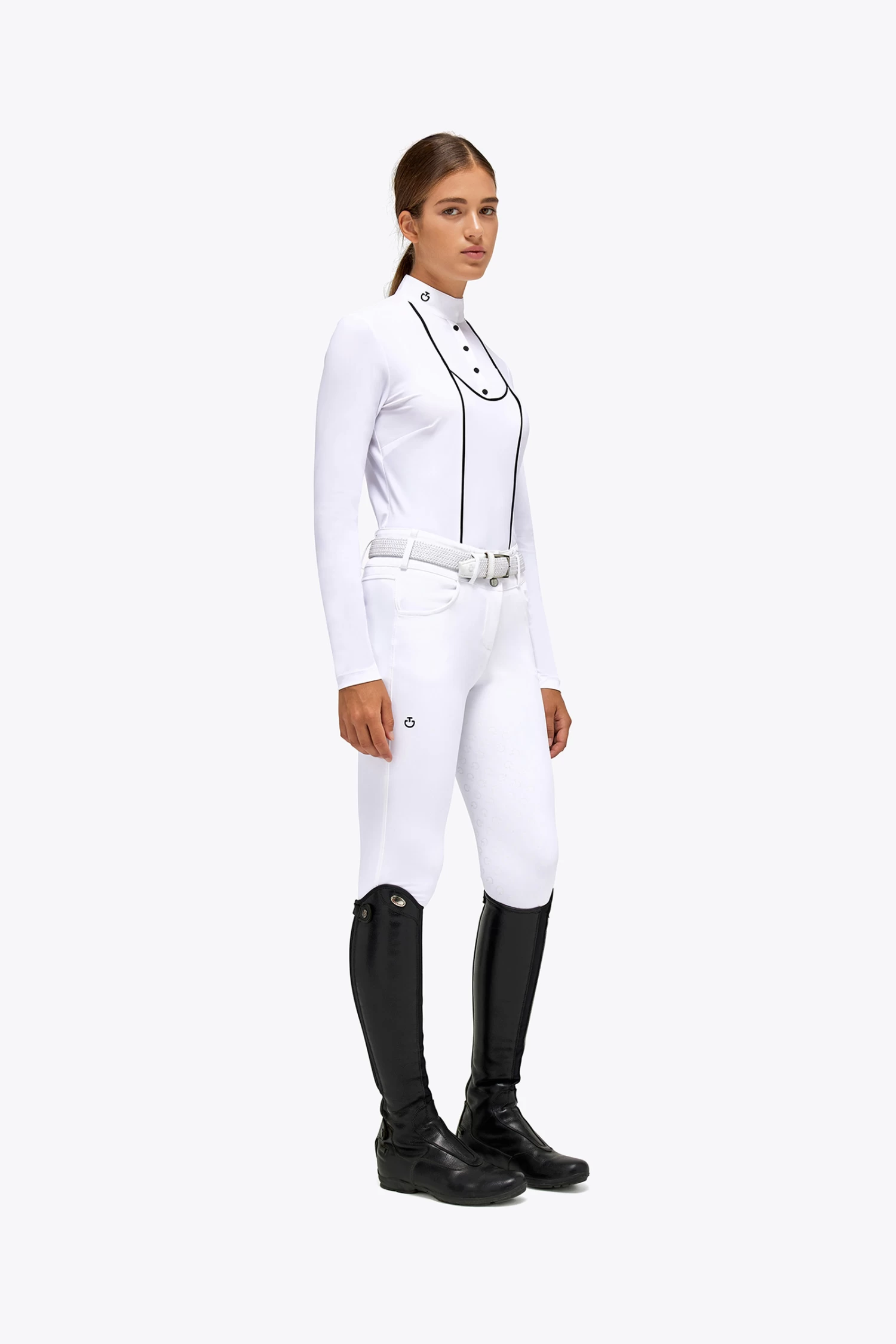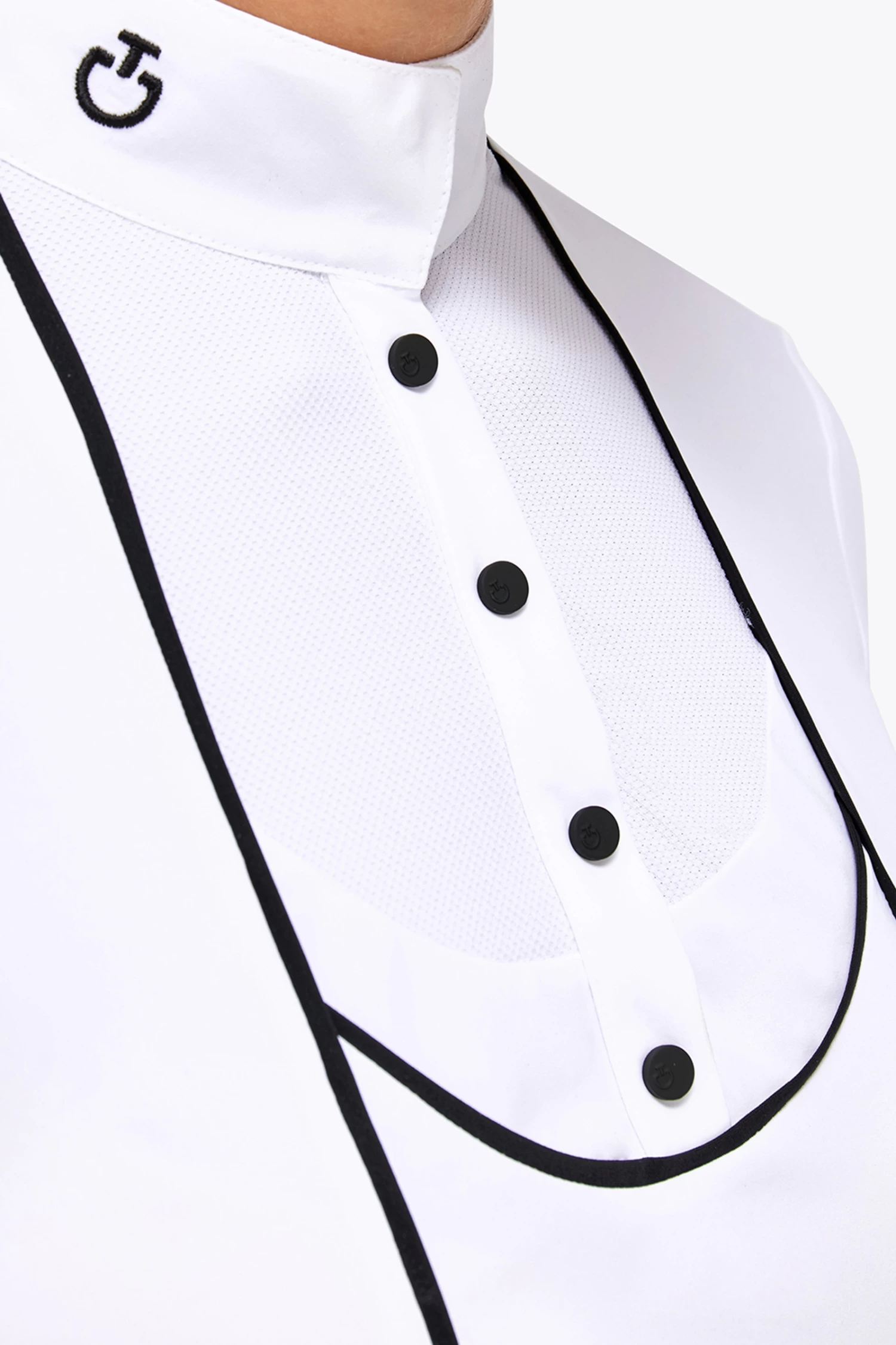 Cavalleria Toscana presents this competition shirt which combines balanced proportions and attention to detail. In breathable jersey, this style stands out for its elegant slim fit and bib with contrast piping details, elongating and complementing the silhouette. The poplin collar with an embroidered CT logo and the branded button fastening complete the look.