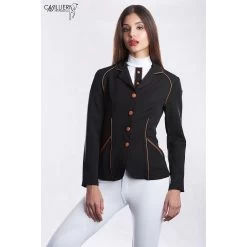 GRAND Show Jacket for women and girls, elegant slim-fit shape, decorated with brown faux-leather piping (Ensuring a skinnier look), matching buttons and hidden pockets.