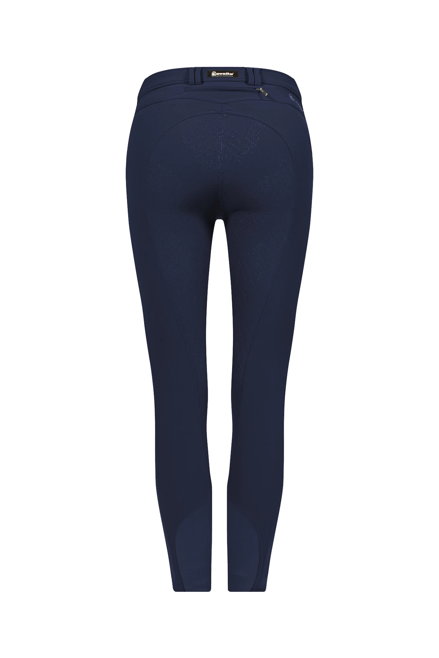 Sporty breeches in 5-pocket-look. Two comfortable pockets in front, decorated with sparkling crystal rivets. Full comfort due to missing dividing seam at knee. Attached mobile phone pocket, with Cavallo typical stripy elastic tape and stirrup print. Additional zip pocket on back yoke provides safe space for important things. Subtle seam layout on back pants creates the perfect, sporty shape.