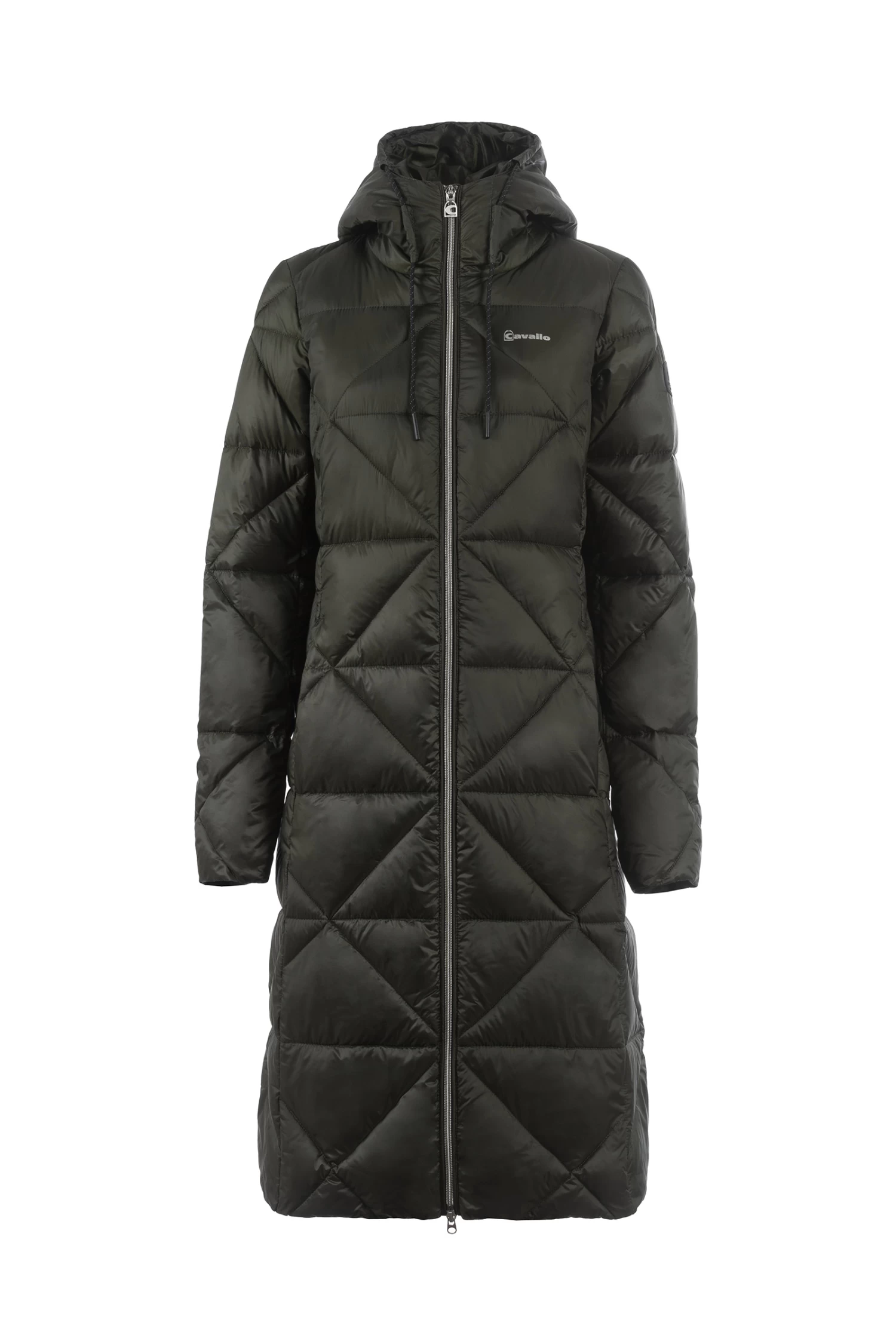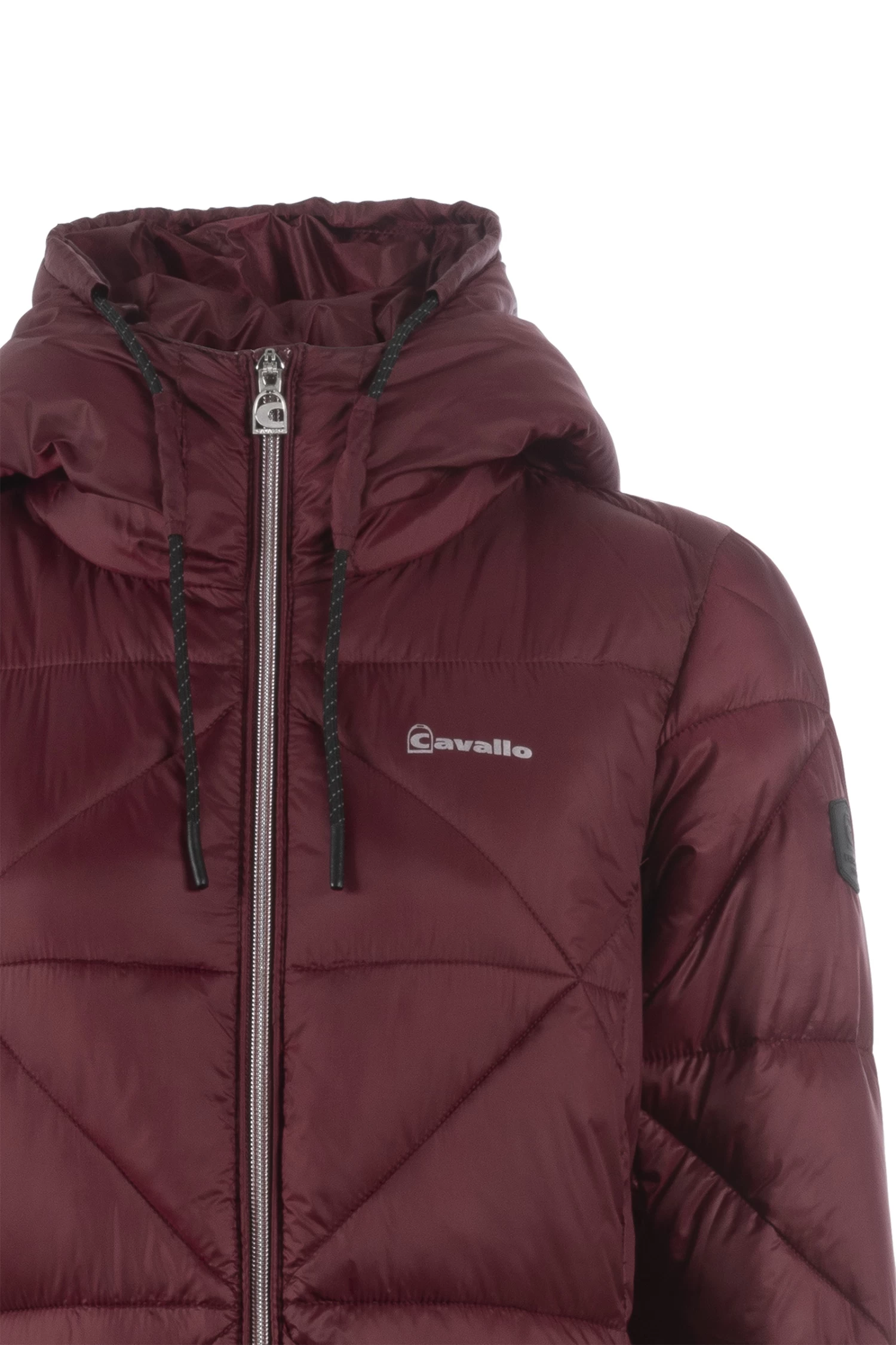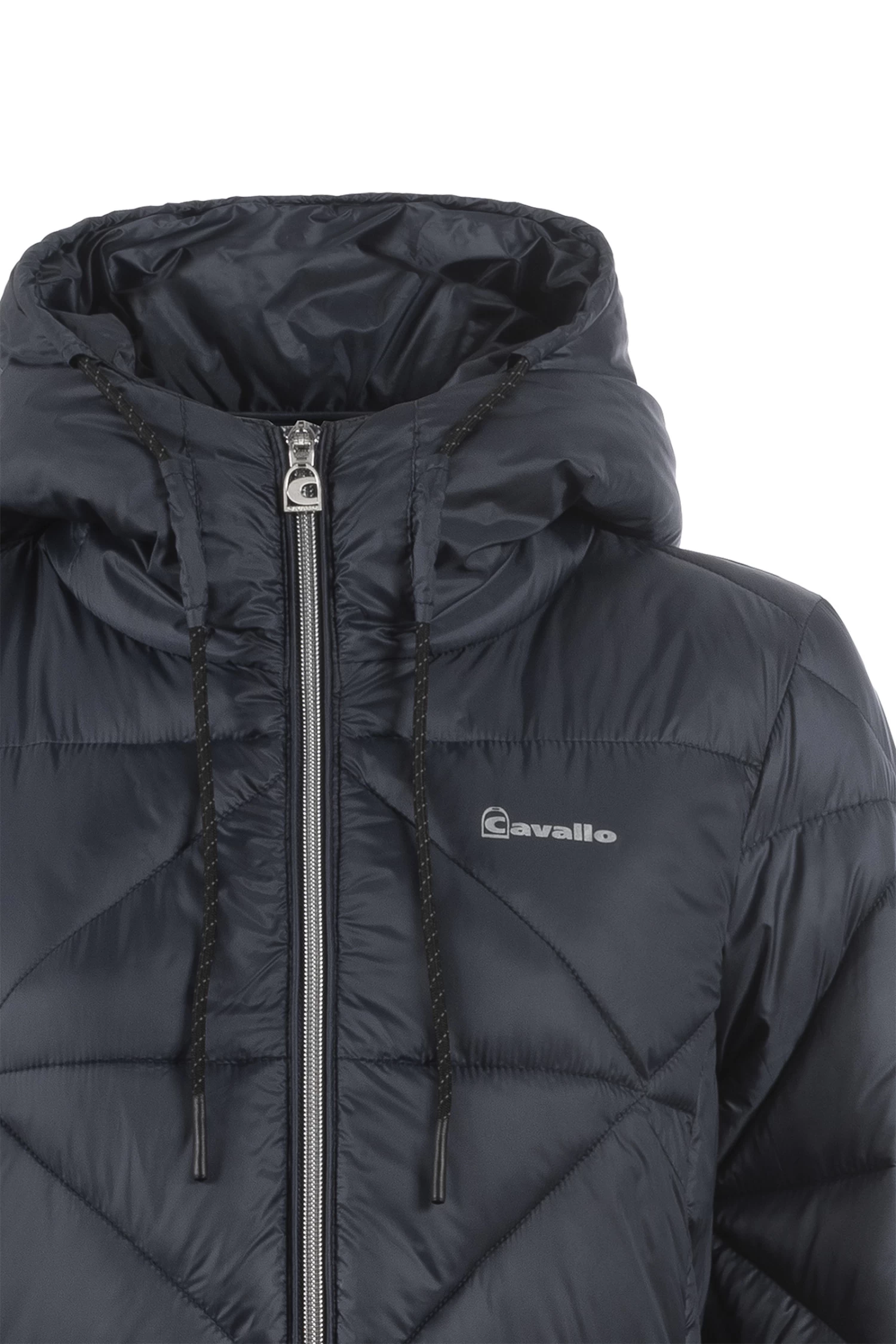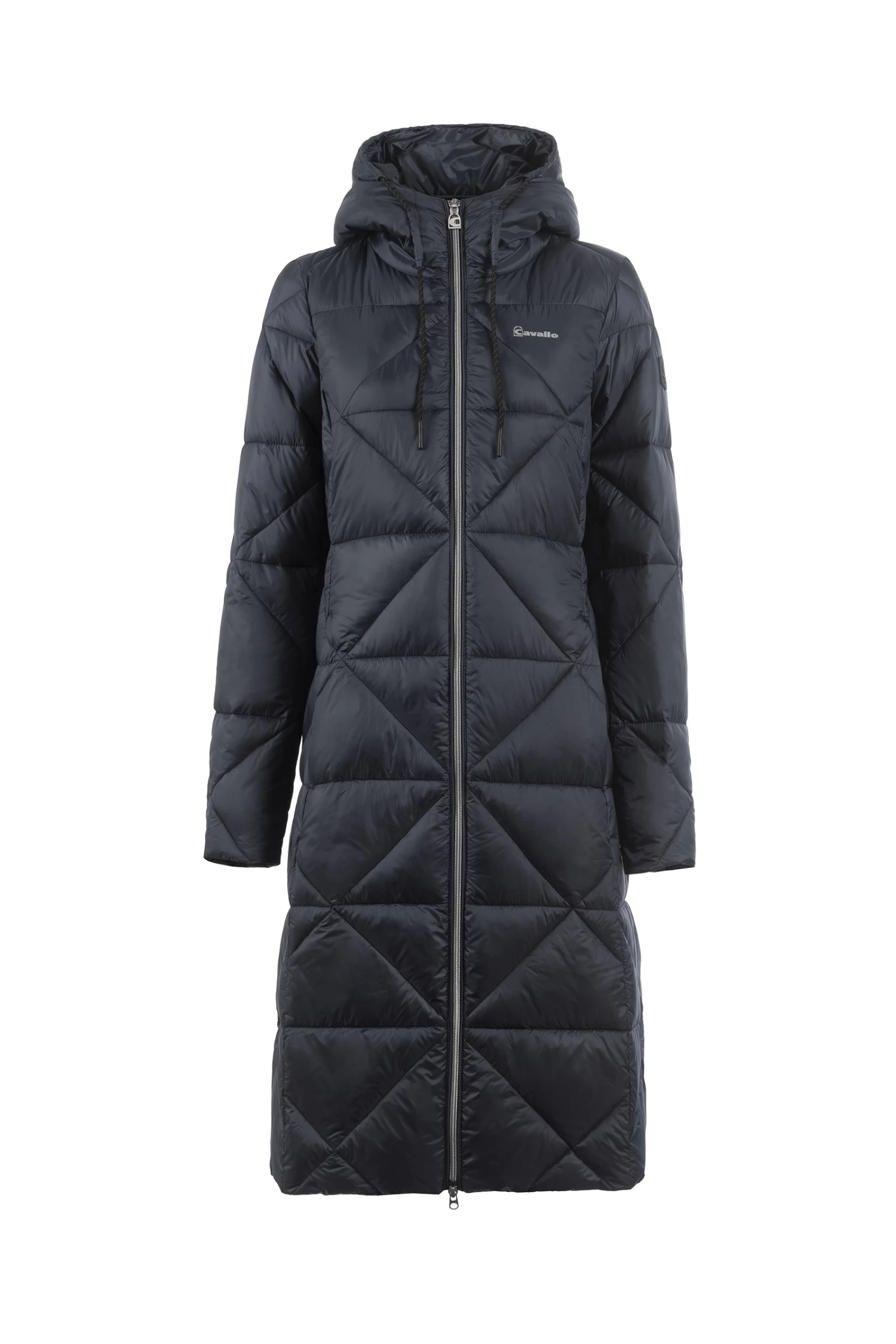 Sporty, feather-light maxi coat with diamond quilting and large hood. Hood decorated with large, tonal Cavallo artwork. Hood with drawstring in black with silver reflective dots. Silver 2-way front zip as well as zips of the front pockets are decorated with a silver Cavallo stirrup zip pendant. Long, tonal zip in the centre back allows wearing while riding. Silver sparkling Cavallo lettering on the left chest. Reflective Cavallo logo patch on the left upper arm.