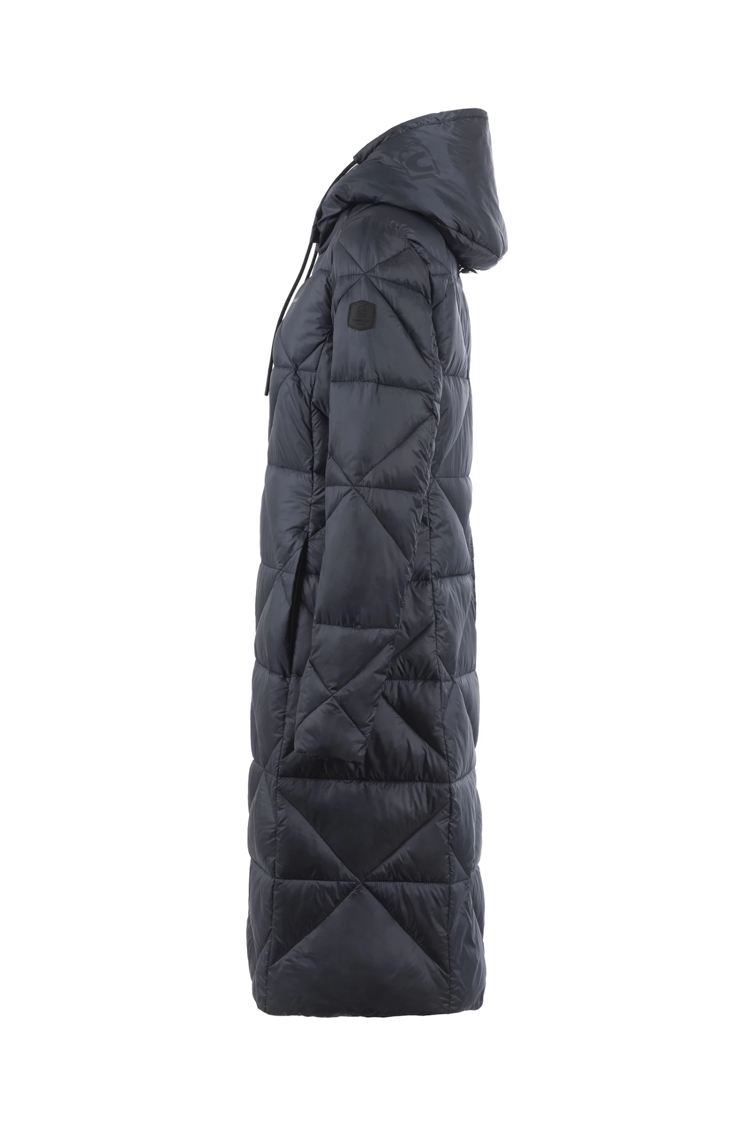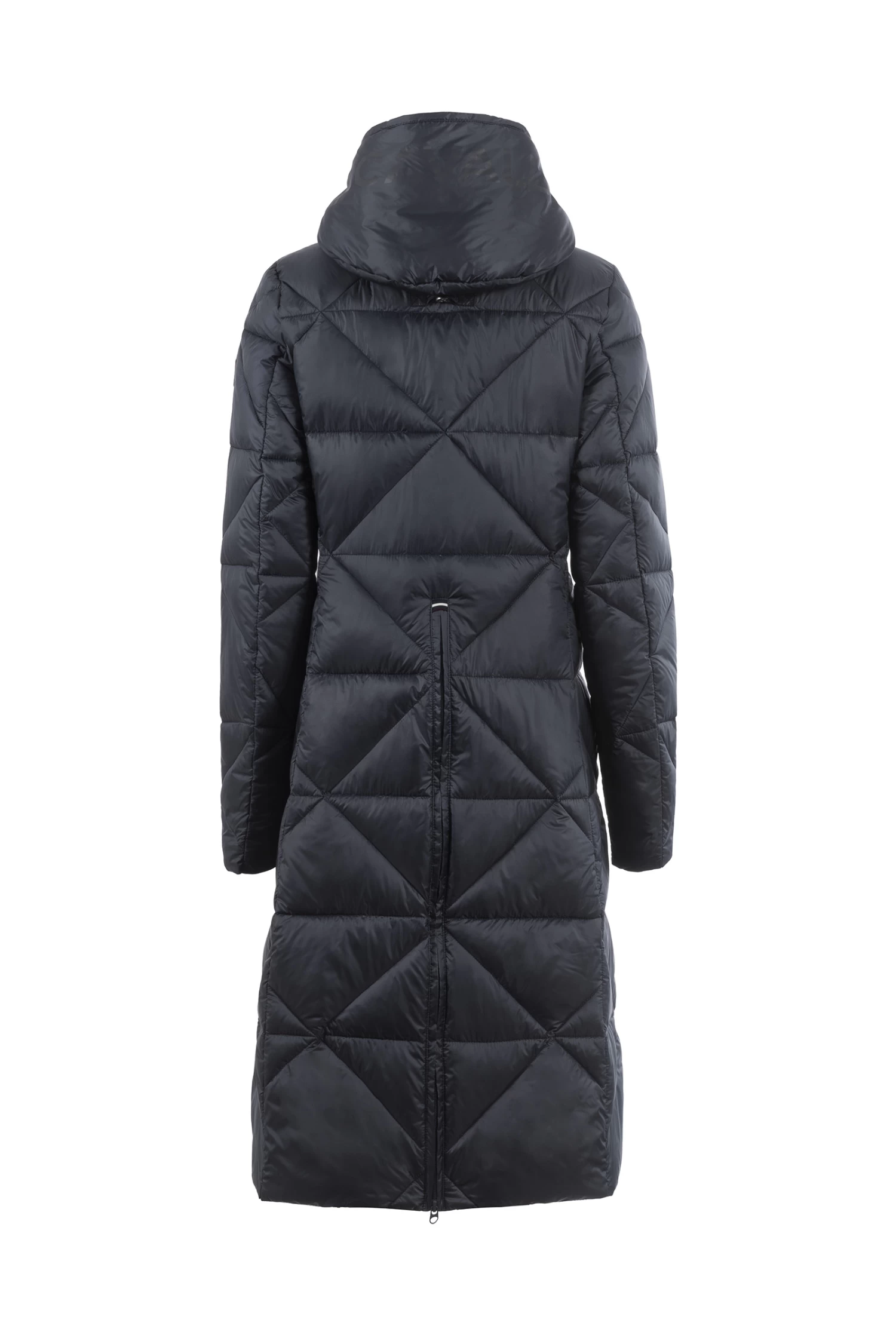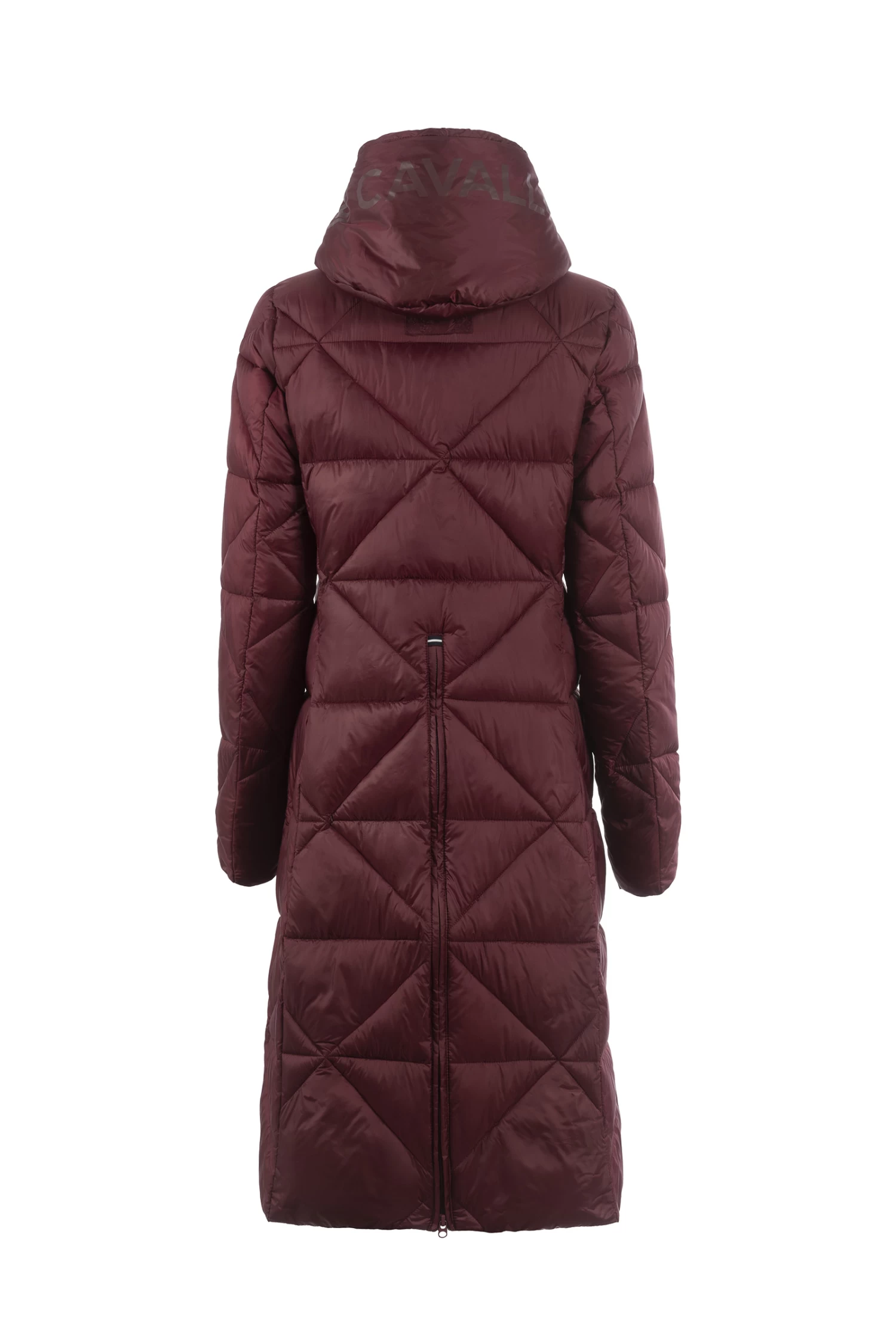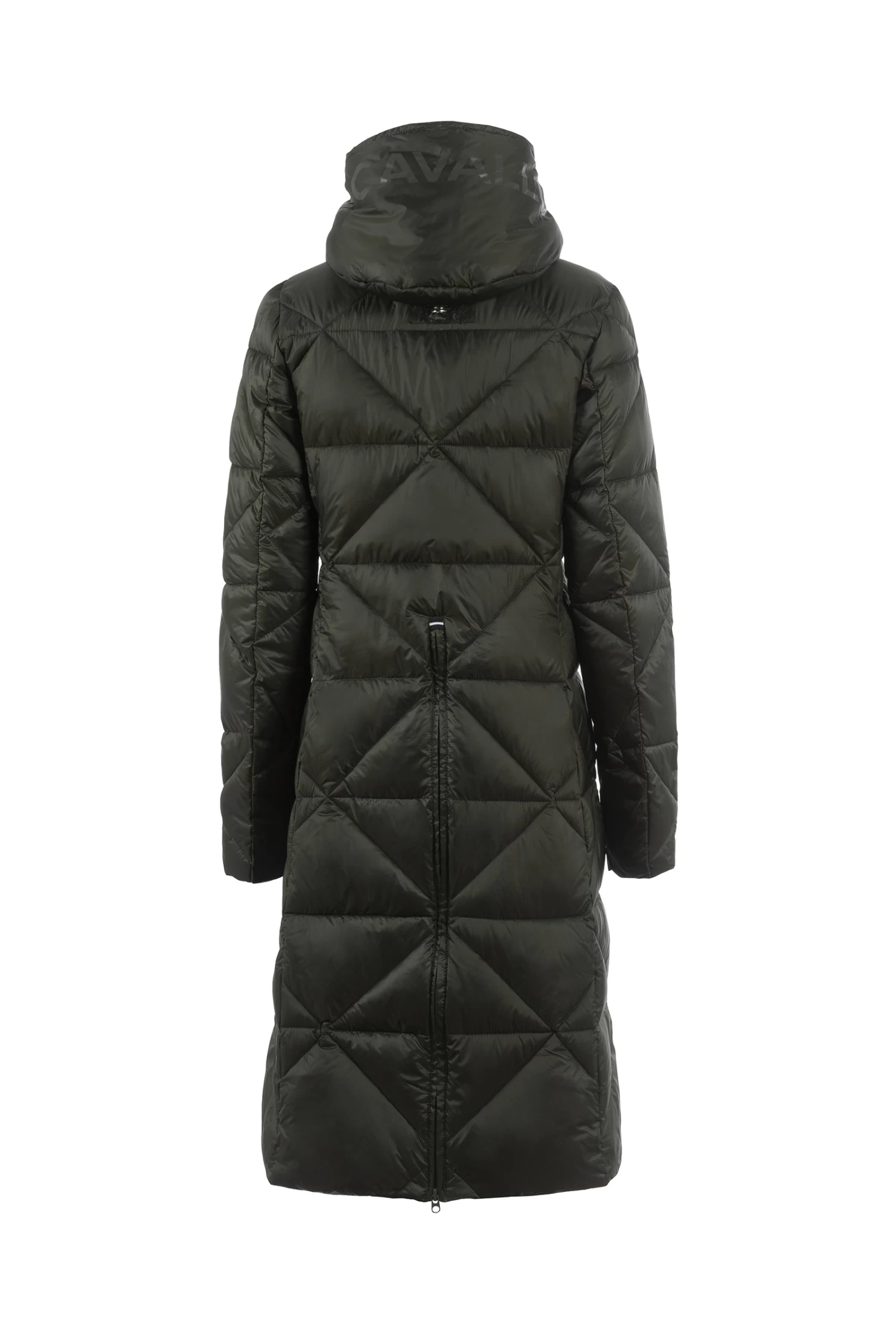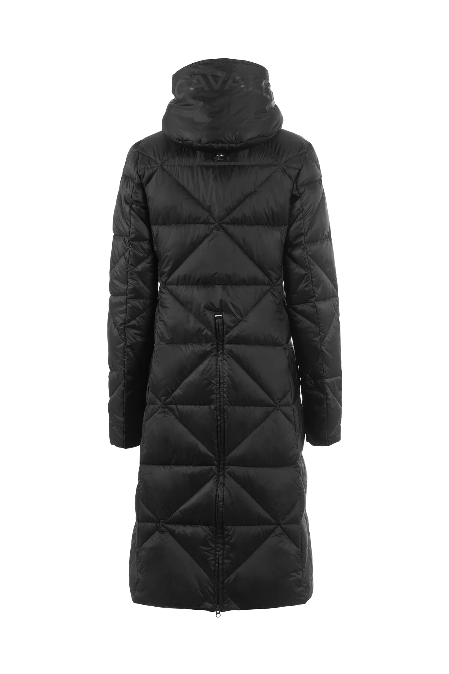 Sporty, feather-light maxi coat with diamond quilting and large hood. Hood decorated with large, tonal Cavallo artwork. Hood with drawstring in black with silver reflective dots. Silver 2-way front zip as well as zips of the front pockets are decorated with a silver Cavallo stirrup zip pendant. Long, tonal zip in the centre back allows wearing while riding. Silver sparkling Cavallo lettering on the left chest. Reflective Cavallo logo patch on the left upper arm.