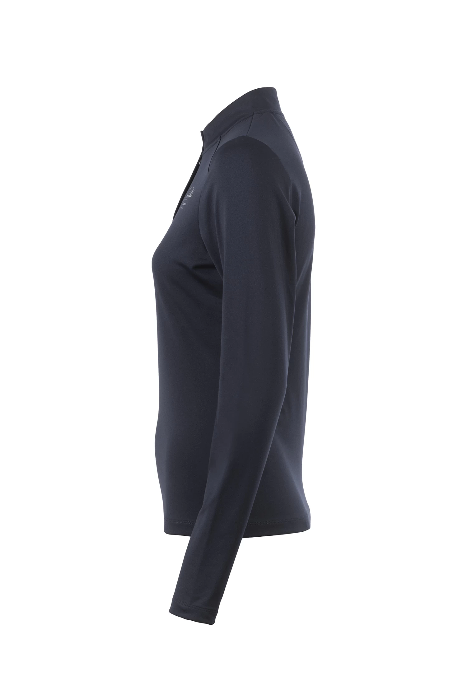 Lightweight longsleeve with stand-up collar made of bi-elastic functional jersey. Jersey slightly roughened on the inside for extra wearing comfort. Short zipper in the centre front. Zip trim with decorative crystals. Silver, subtly glittering Ingrid Klimke artwork with crystals on the left chest. Silver Cavallo stirrup print on the back of the stand-up collar.
