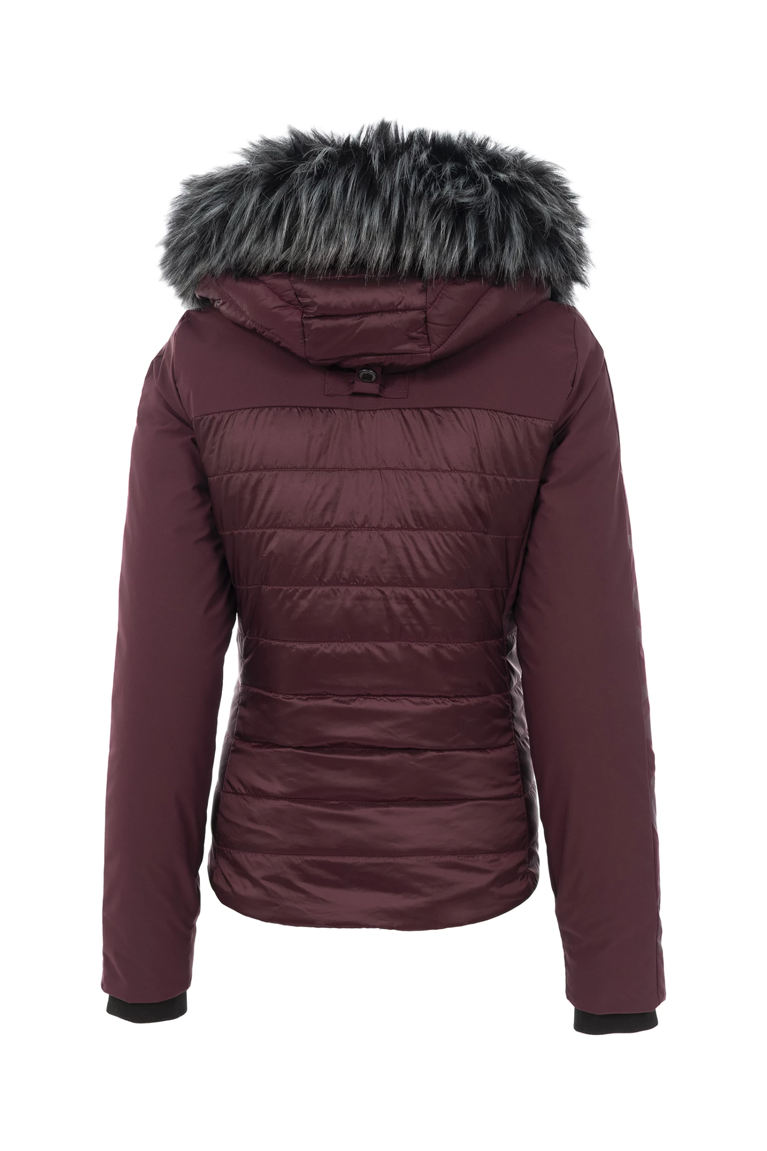 With detachable hood with faux fur trim. Quilted design visible on the outside of the front and back as well as the lower side panel. Quilting visible everywhere on the inside with large Cavallo print on the back. Shoulder, sleeves and upper side part smooth on the outside. Two zipped pockets with Cavallo crystal pendant. Left breast pocket with reflective zip. 2-way zip at centre front. Front zip and chest pocket zip also with Cavallo jewellery pendant with crystal. Inside pocket with zip. Large tonal Cavallo artwork along the sleeves. Sleeve cuffs with inner knitted waistband in black.