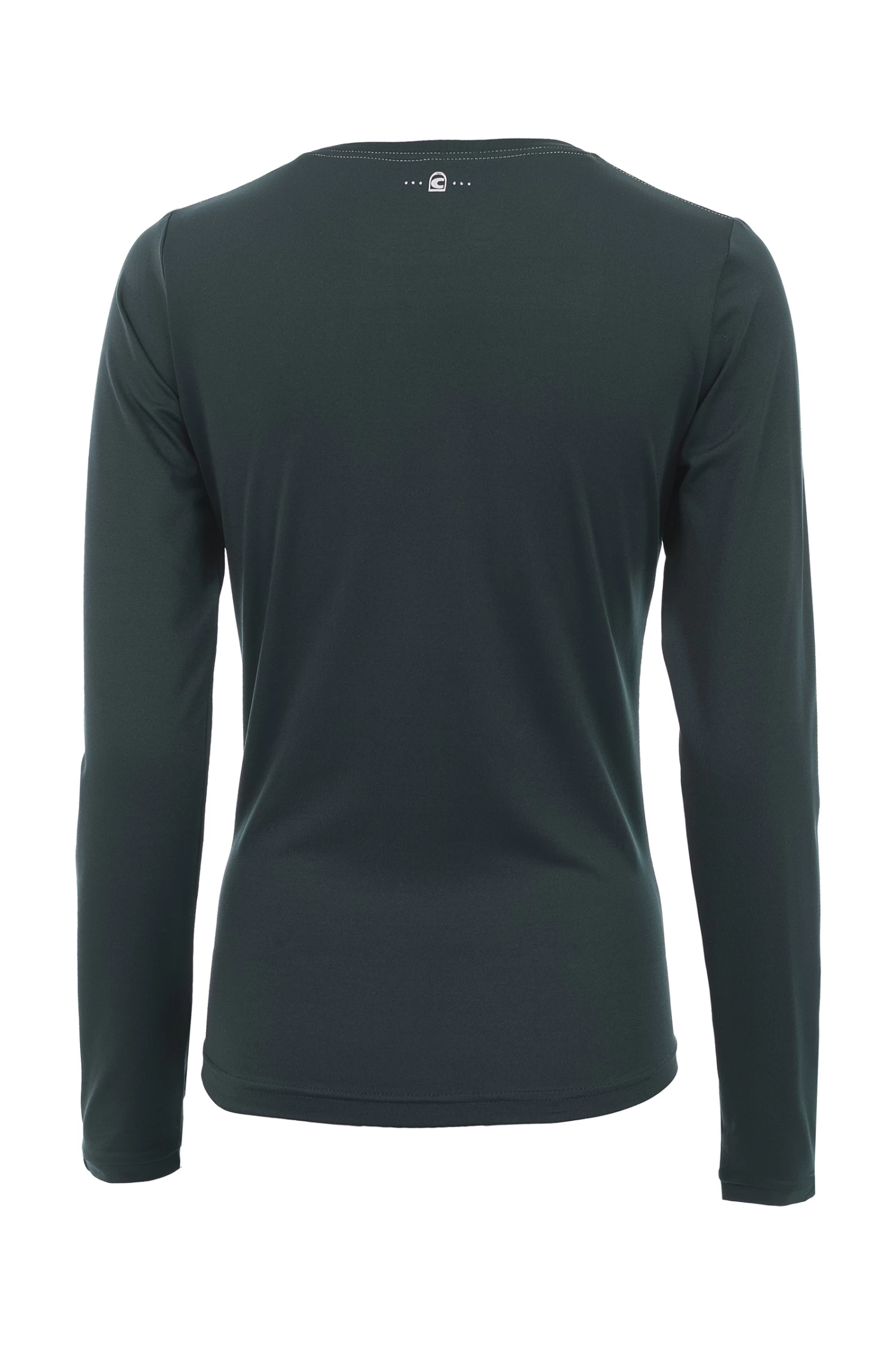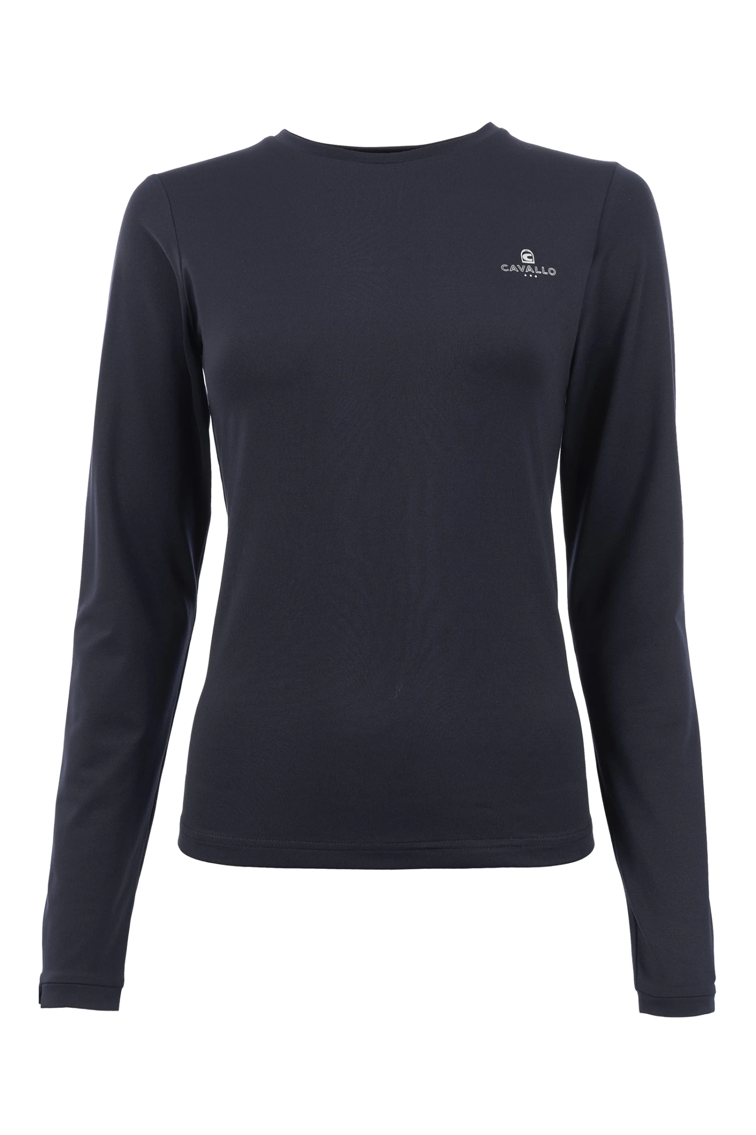Made of bi-elastic functional material. Silver Cavallo logo on the left chest. Seams with silver thread at the back neckline and shoulder. Silver artwork with crystals below the neckline at the back centre.