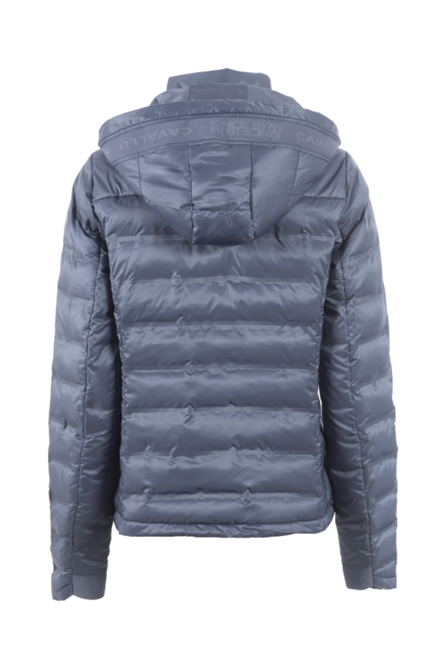 Filled with fake down jacket with modern hollow effect in the centre front and back as well as on the upper arm. Detachable hood can be fixed at the back. Hood and sleeves are decorated with a tonal logo band. Hood with drawstring. Sleeve hem extends to cover back of hand 2-way zip in the front as well as two slit pockets with zip and blue Cavallo woven ribbon pendant. Silver artwork on the chest.