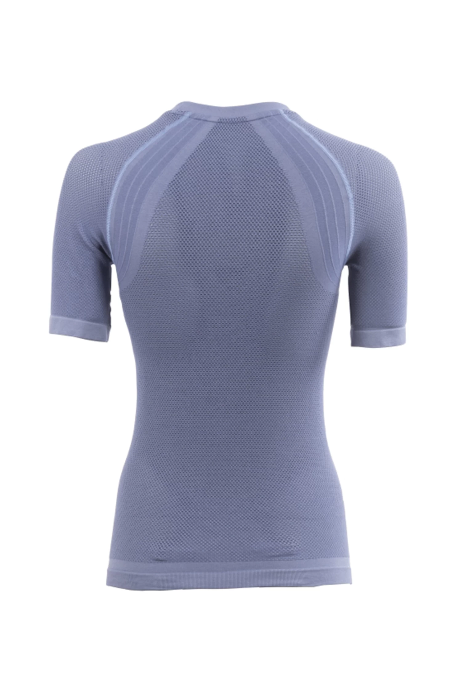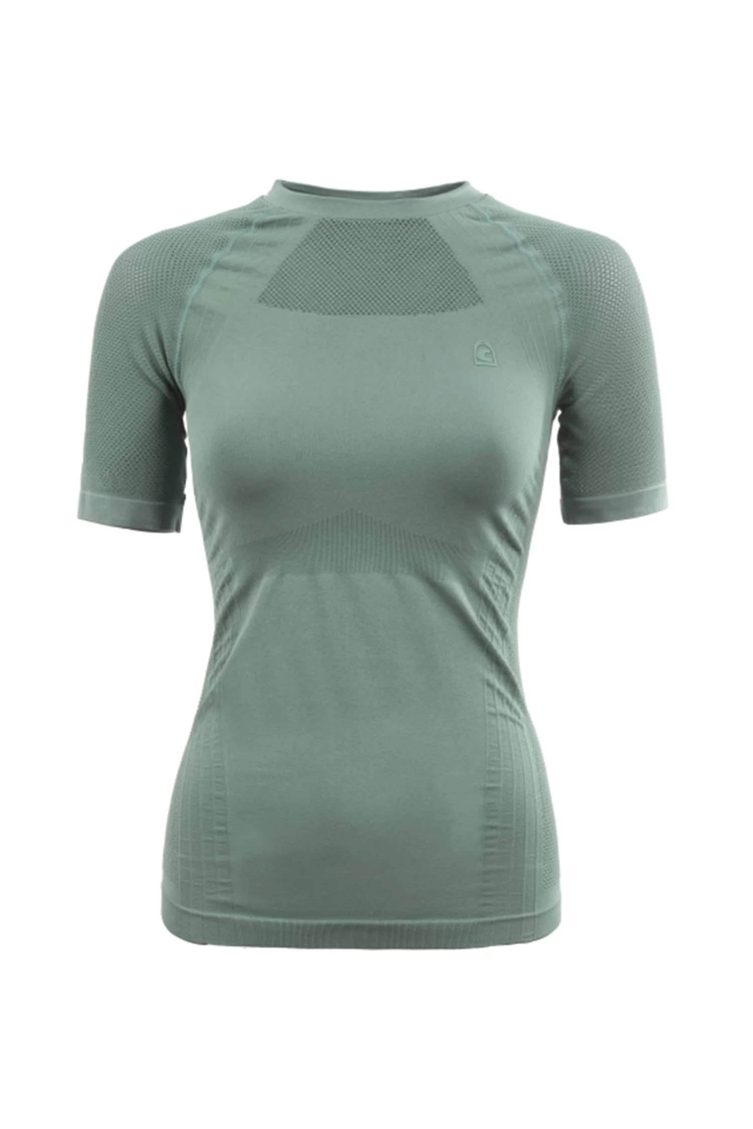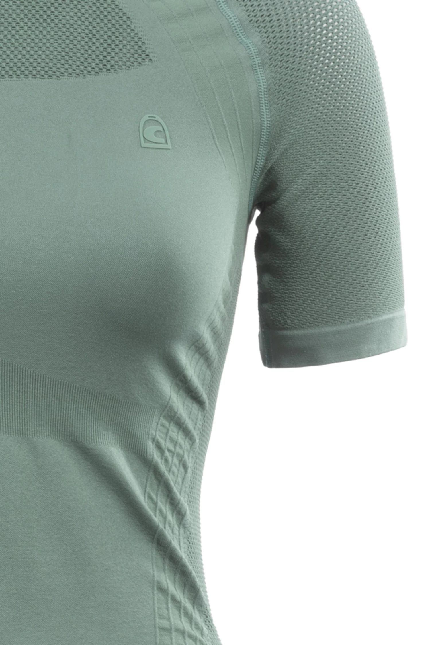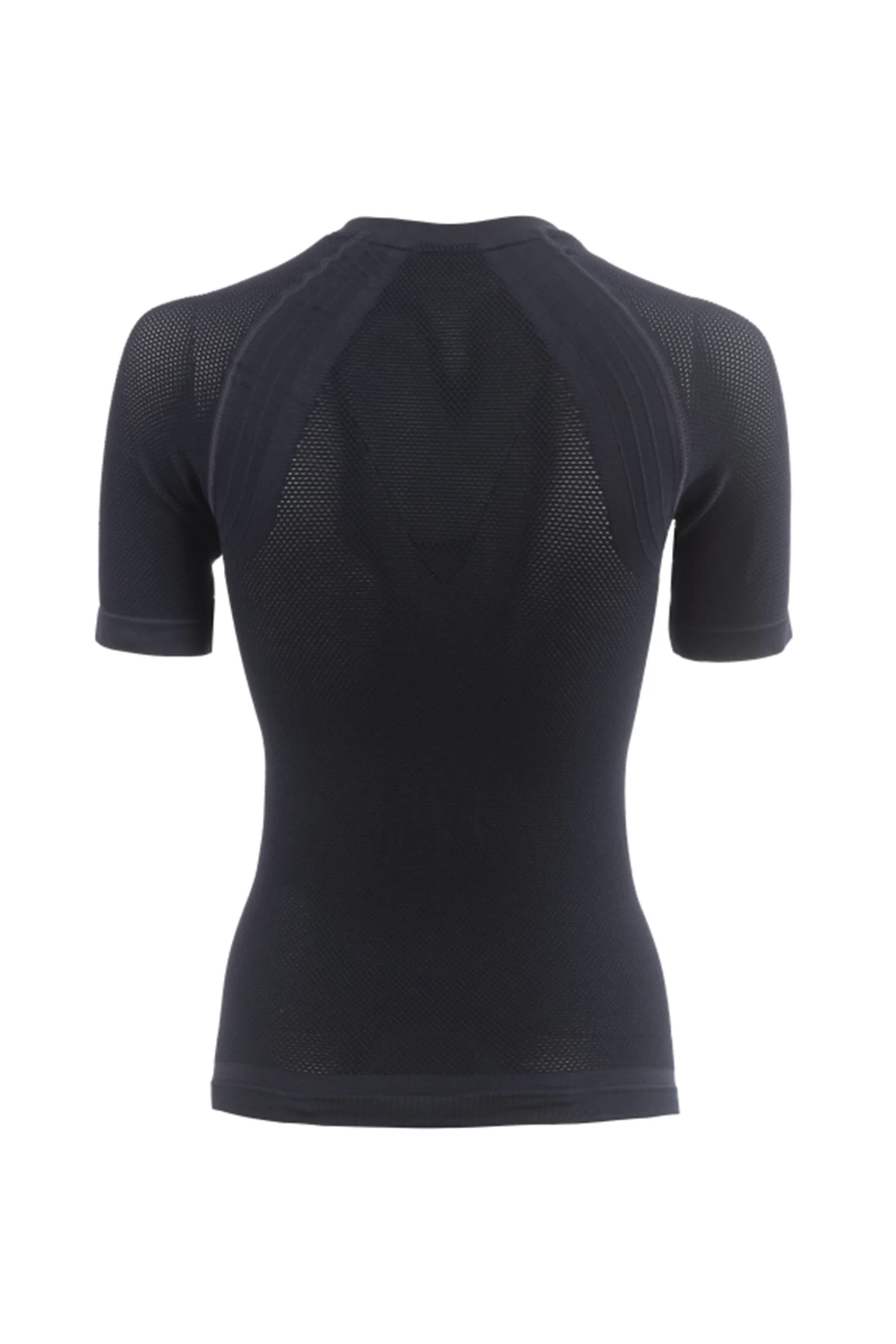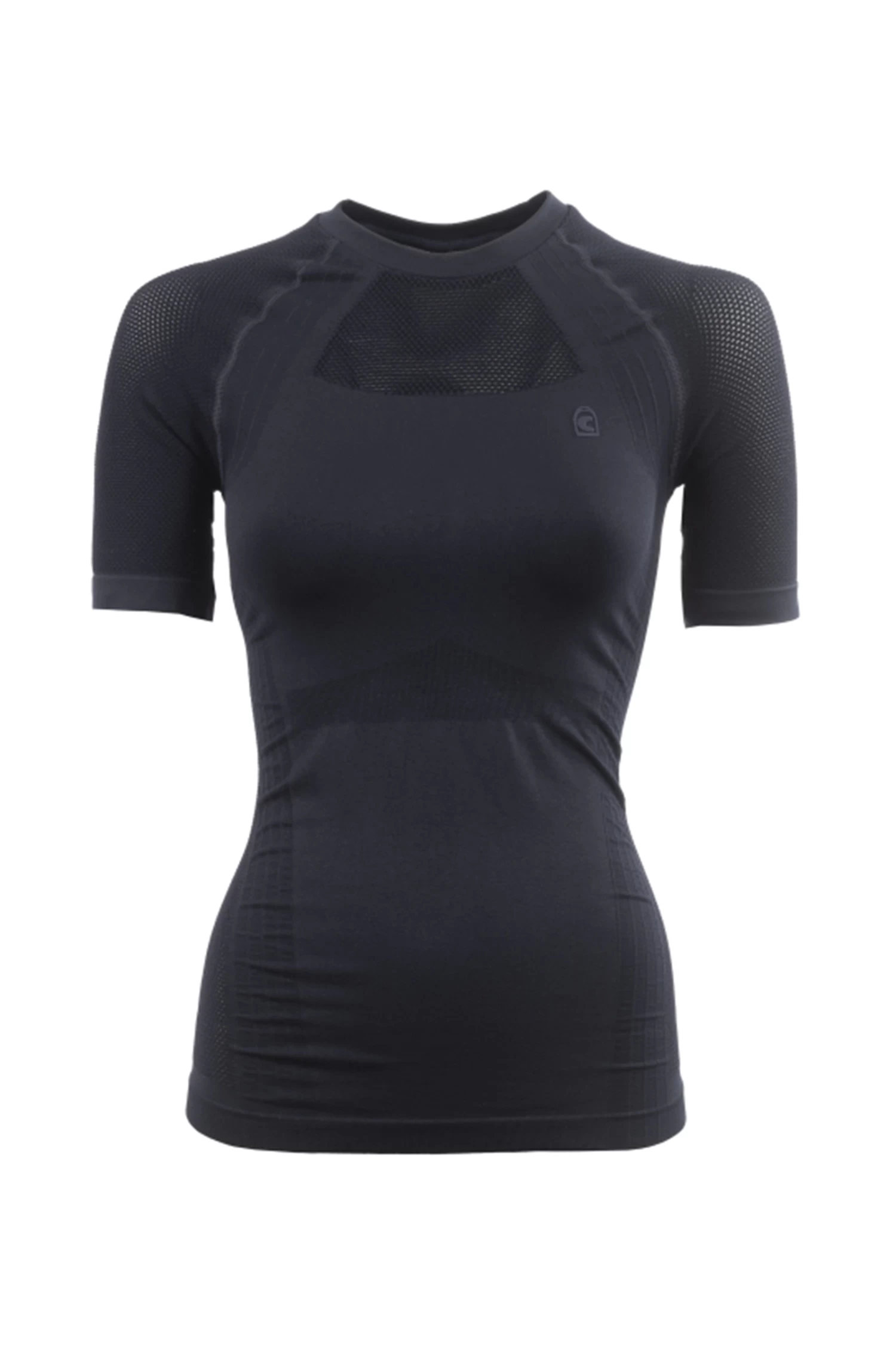 With round neckline. Different structures show different compression zones. The coarse textured area with mesh used in the sleeve and back area is translucen. Tonal raised Cavallo logo on left chest. Extremely comfortable due to seamless finish and high elasticity.