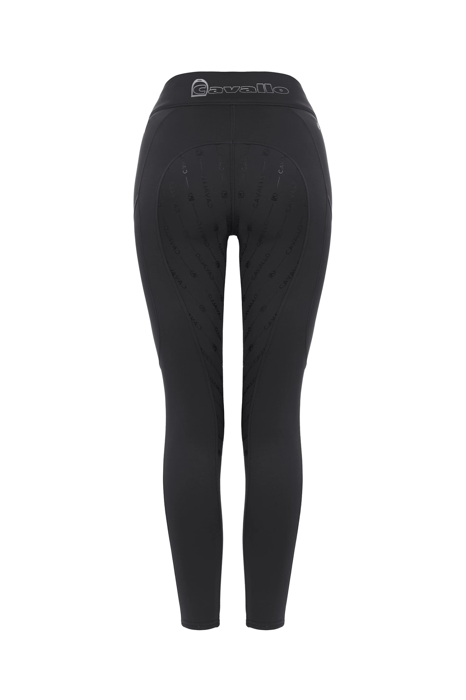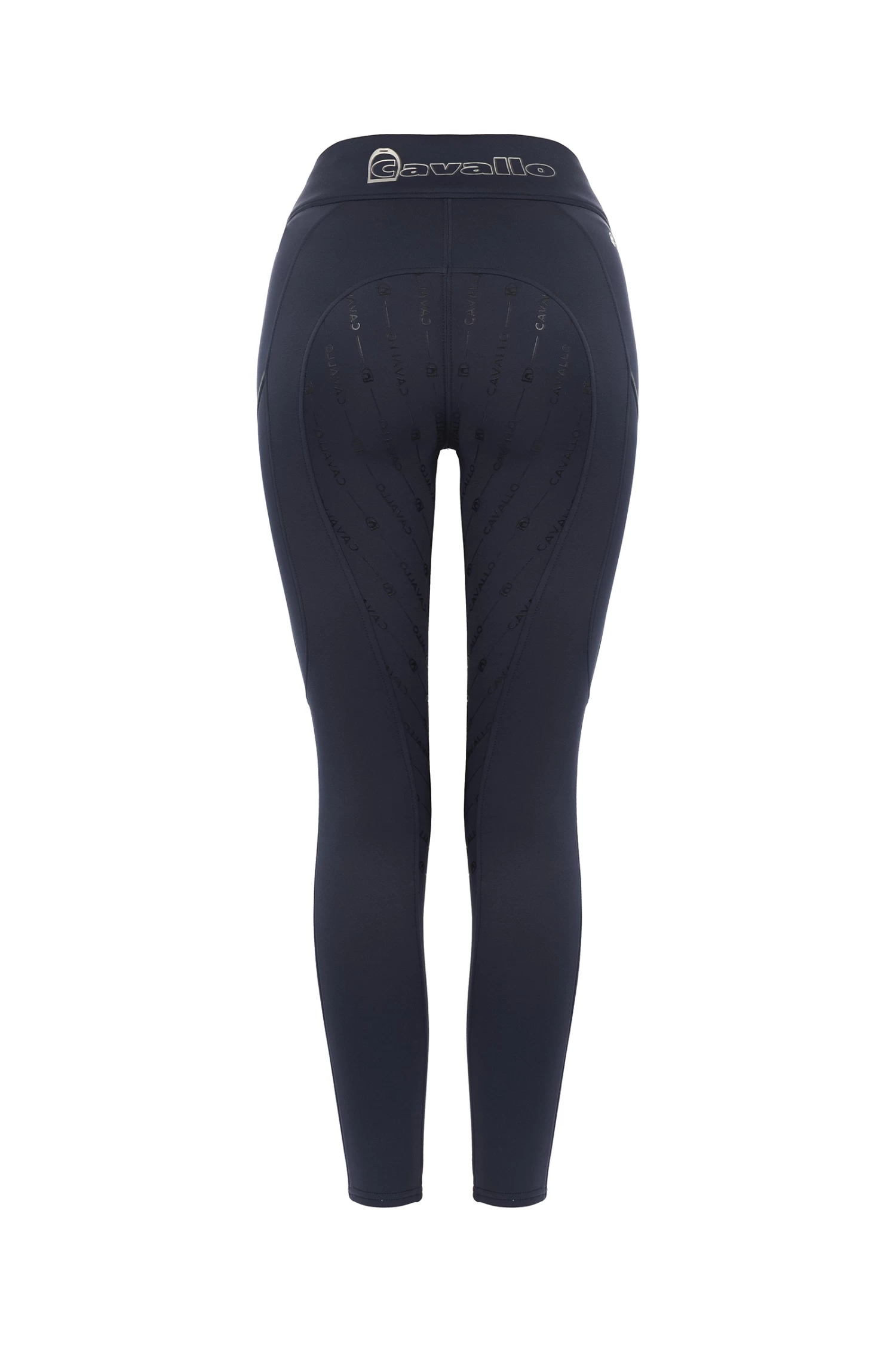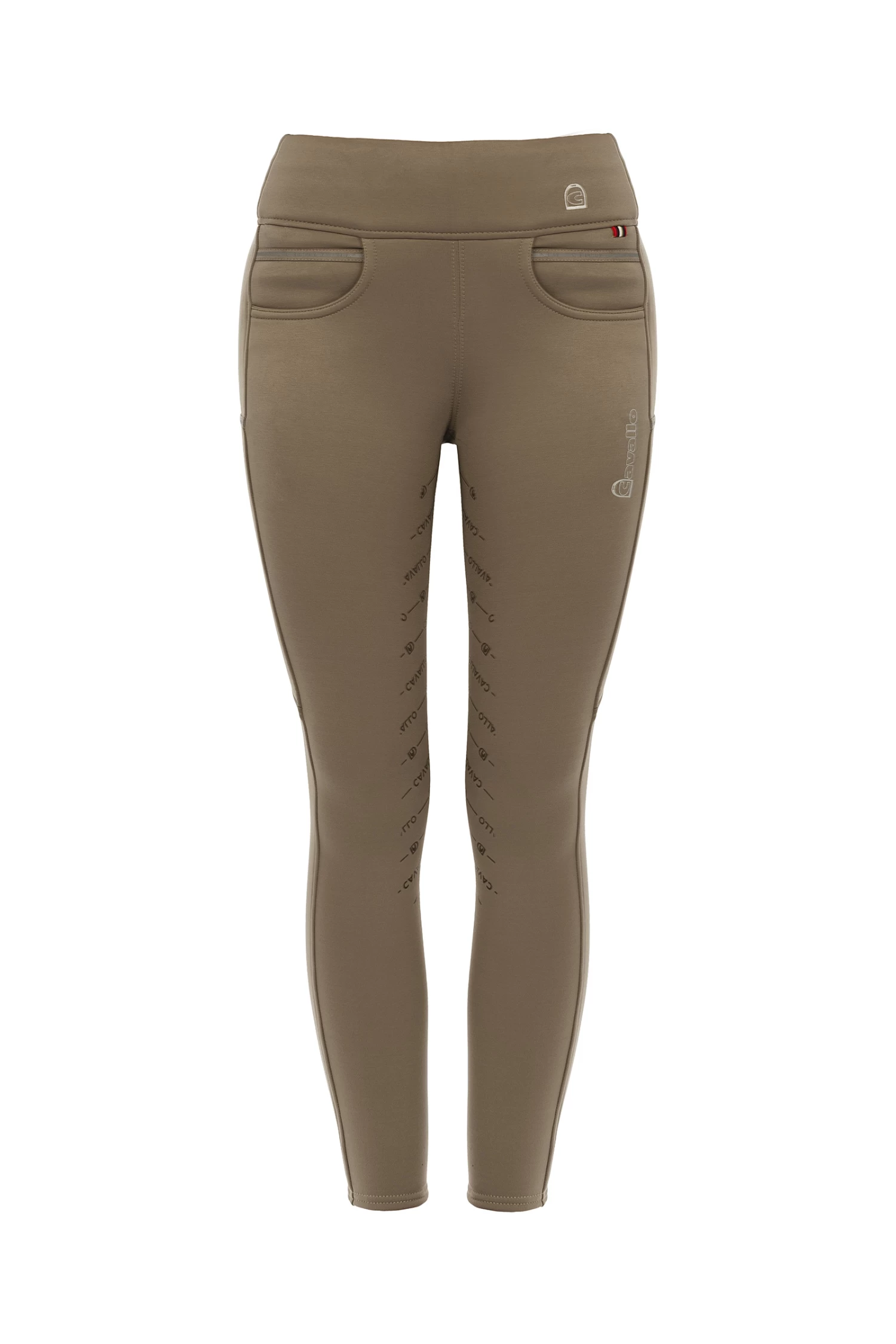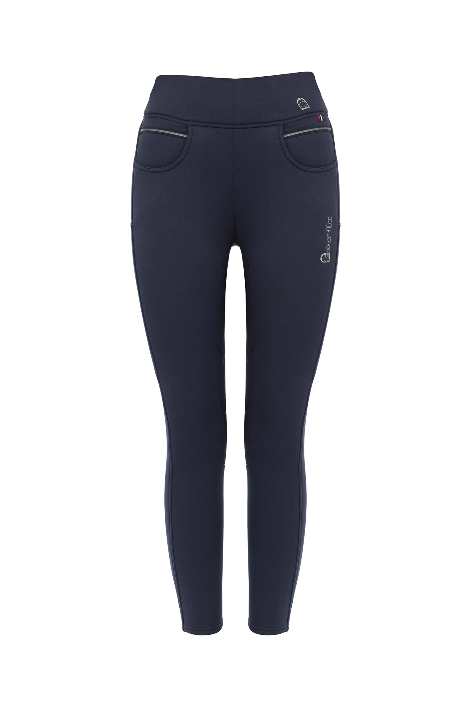 Sporty, warm riding leggings. Winter model of the LIZ GRIP riding tights. Very comfortable, softly brushed material on the inside. Wide waistband with Cavallo print on the back and Cavallo stirrup logo on the front. Fashionable five-pocket look with front pockets. Mobile phone pockets on both sides on the thighs. Canvas band with reflective stripe above the pockets and on the mobile phone pockets. Silicone trim with Cavallo lettering.