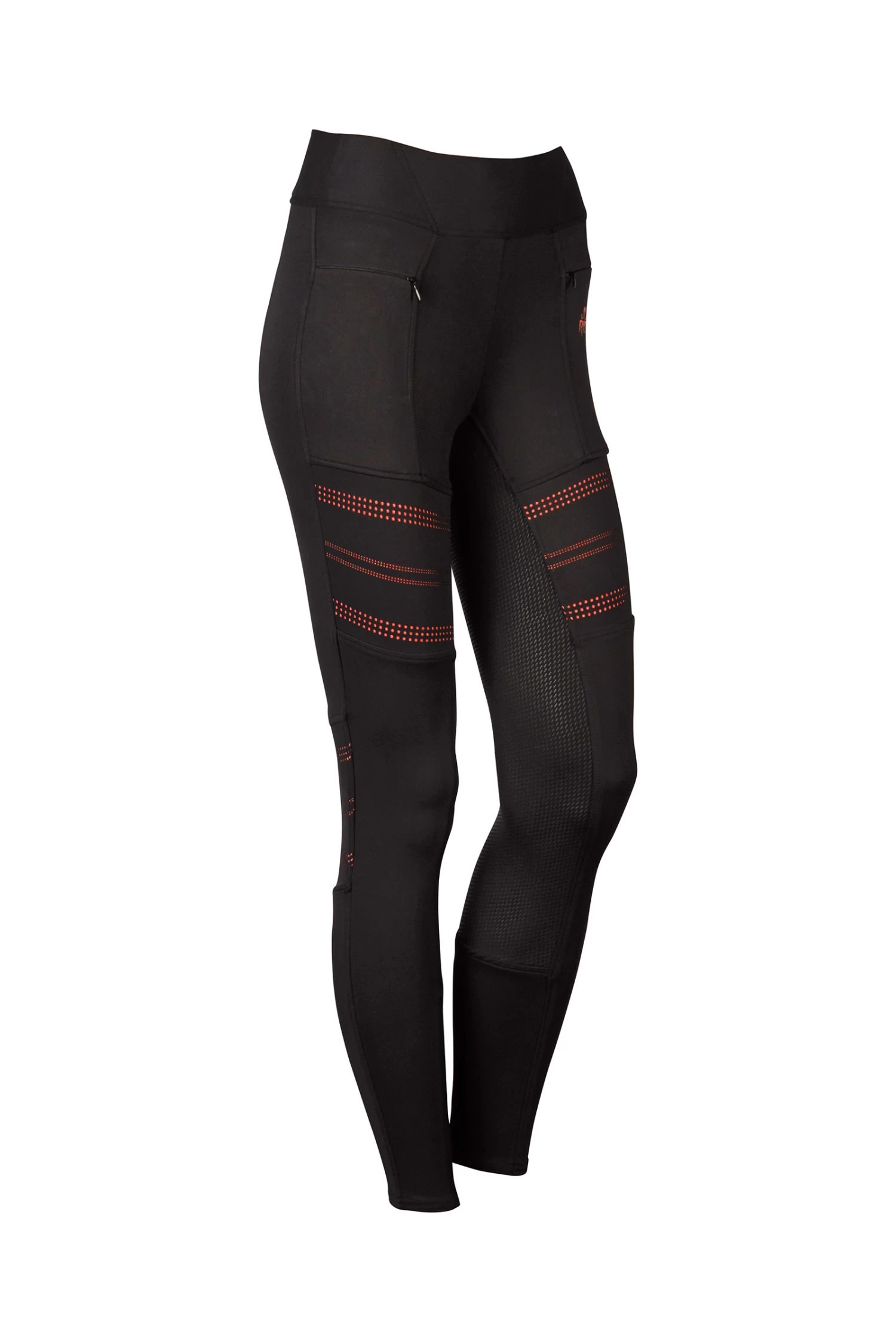 Riding tights with a round stitched seat with a silicone print for extra grip in the saddle, comfortable high waistband at the back, two pockets with invisible zipper and the Just Ride logo on one side, a lasercut with a melange contrast fabric underneath, flexlegs at the front extra comfort in the riding boots.
