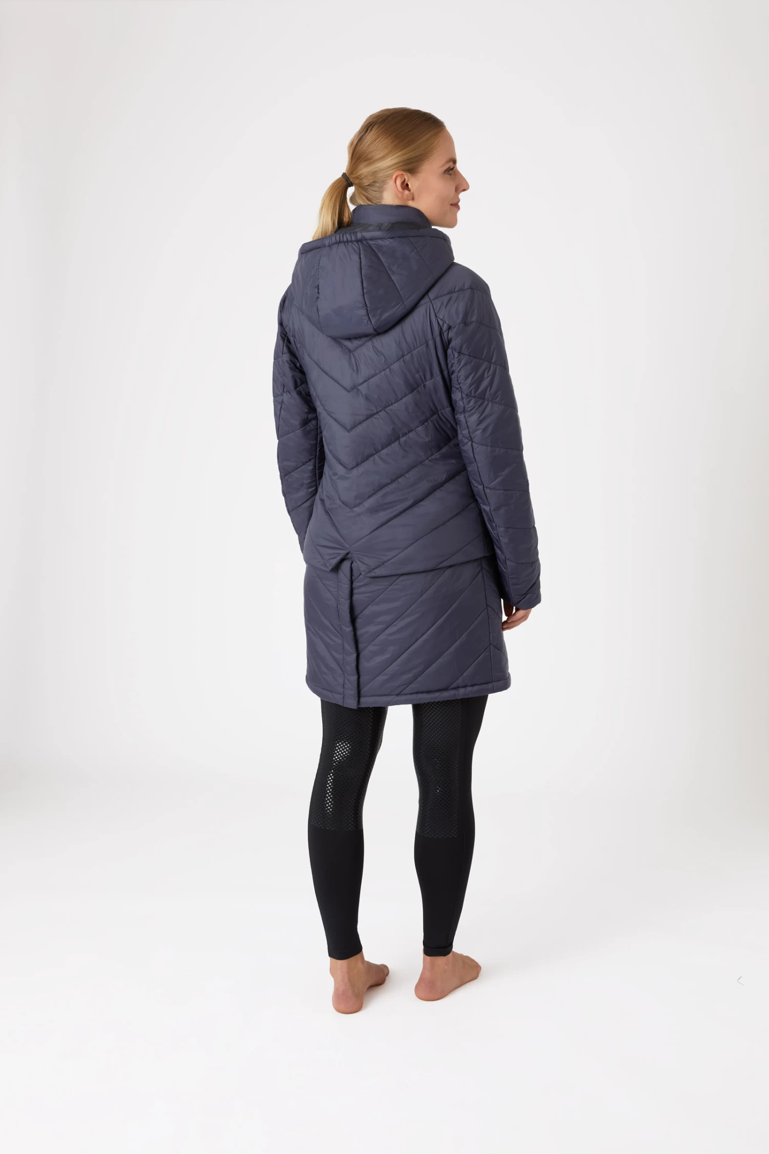 The Horze Aurora riding parka has water repellent and breathable fabric to keep you dry and comfortable. The padding is warm, and the long cut with back slit protects your legs when riding. A zipper quickly turns the parka into a riding jacket. The high collar with hood adds extra protection. Flattering seams and quilting provide a pretty shape. Raglan sleeves keep you flexible. Two zipper pockets hold your belongings.
