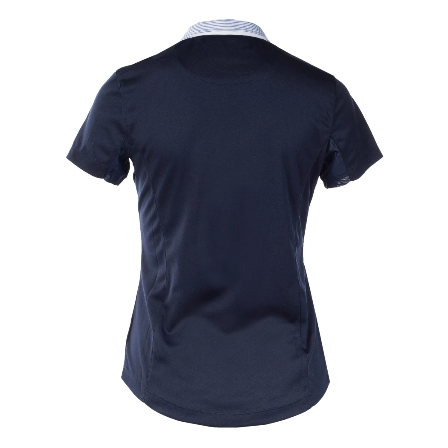 Transform this lovely riding polo-style shirt to a show shirt by turning the collar up and exposing the plain white inside. You can also wear it flat to show off the stylish stripe pattern. This breathable shirt has mesh fabric under the arms for maximum air flow. With UV protection in the Nanotex® fabric and maximum breathability, this will be your favorite quick drying summer shirt for all of your riding needs.