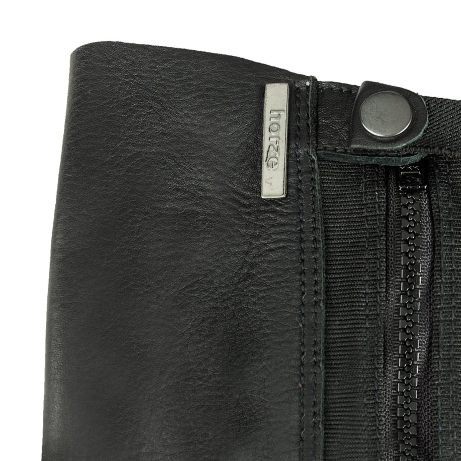 Soft leather chaps from real aniline leather with original grain are a great choice for a casual everyday half chap at a nice price. Raw edges on the top and bottom and double rib elastic with a strong stirrup elastic at the bottom are functional and look great.