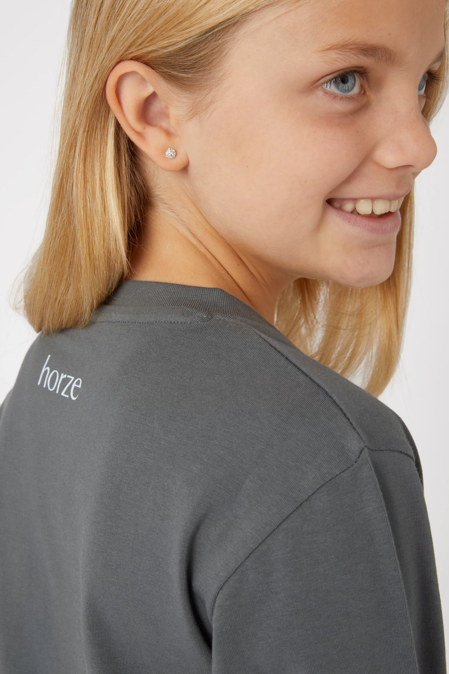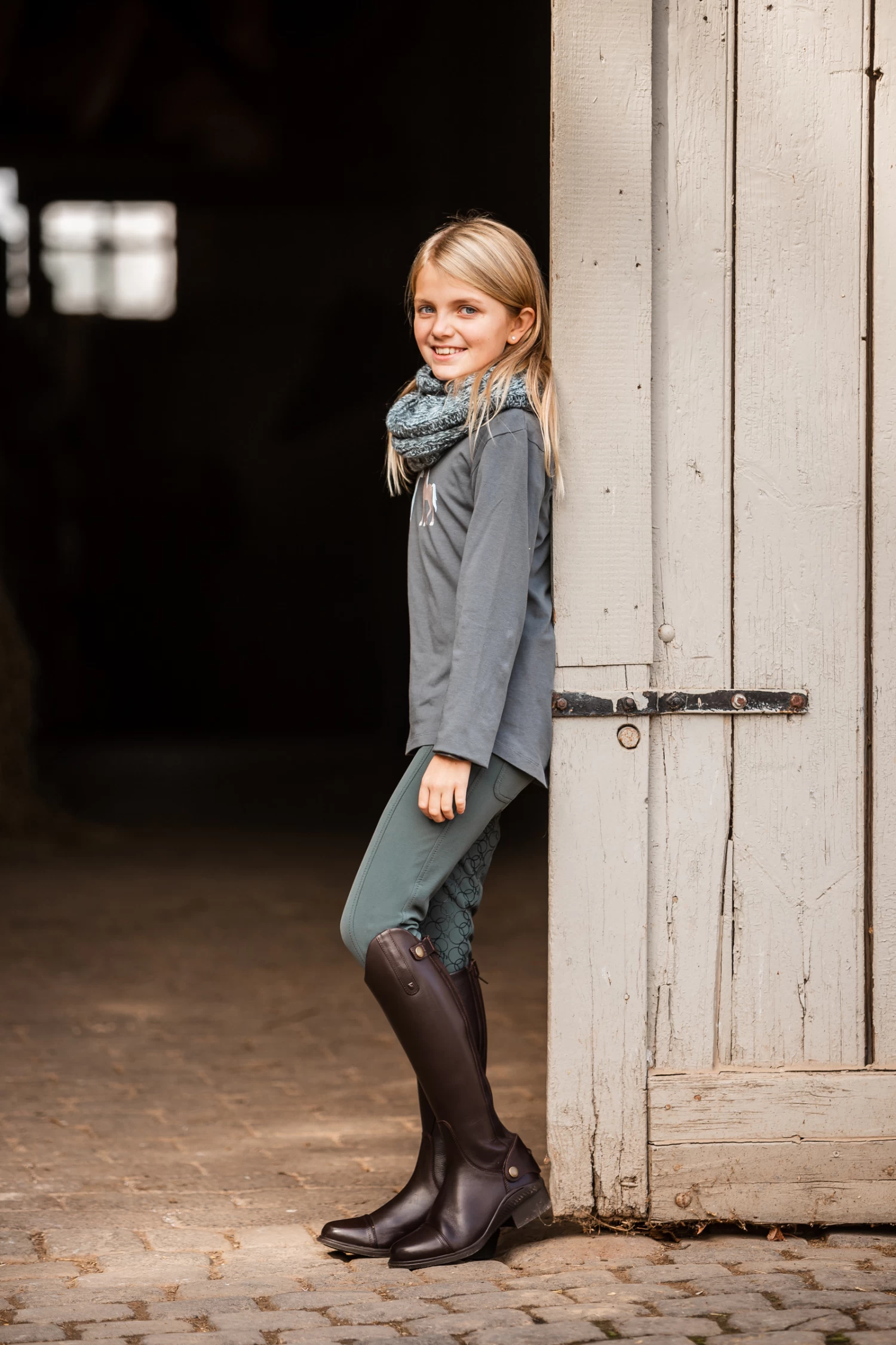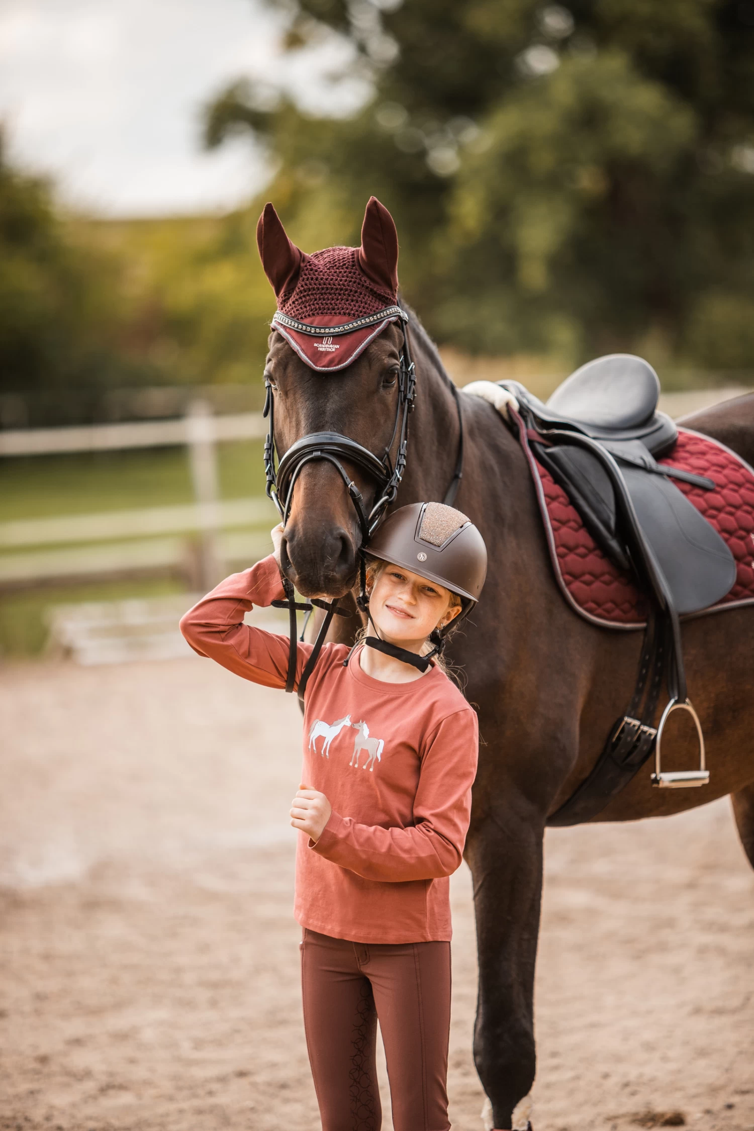 The Horze Leighton teens long sleeve is soft and elastic to keep you comfortable while riding and in your free time. The pretty chest print shows your love for horses. Pair it with your favourite jeans or breeches!