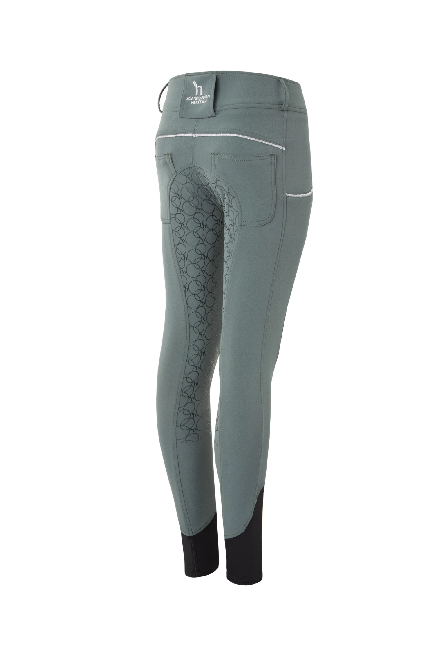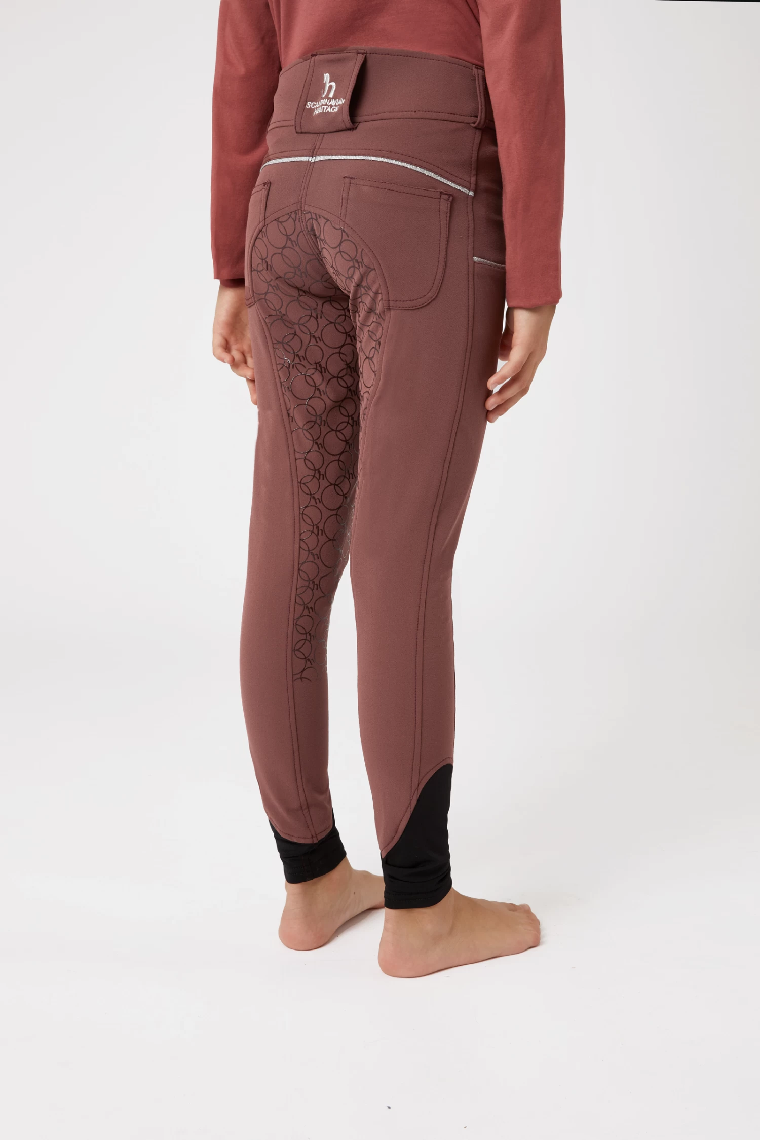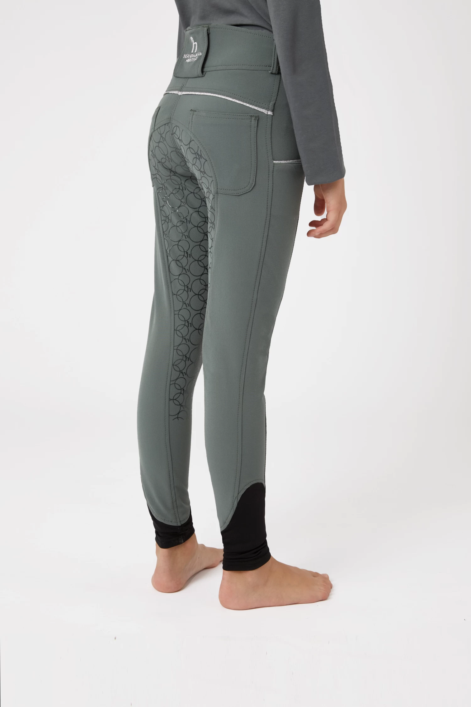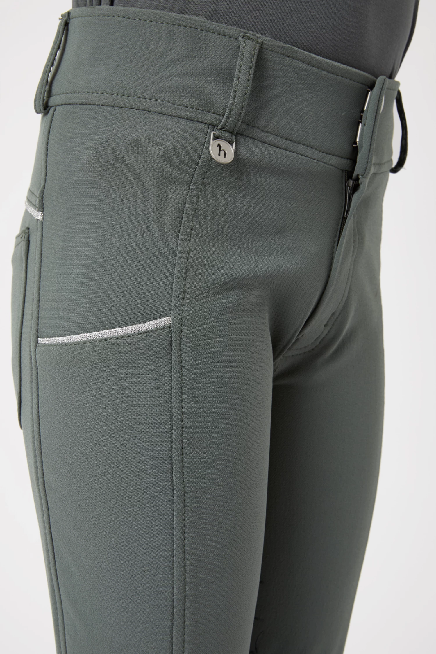 The Horze Leighton teens breeches are equipped with a high waist that keeps them in place and a silicone full seat that provides grip to the saddle. The thigh pocket is perfect for your phone. Silver piping sets a lovely accent. Pair them with the rest of our Horze Leighton teens collection for a full look!