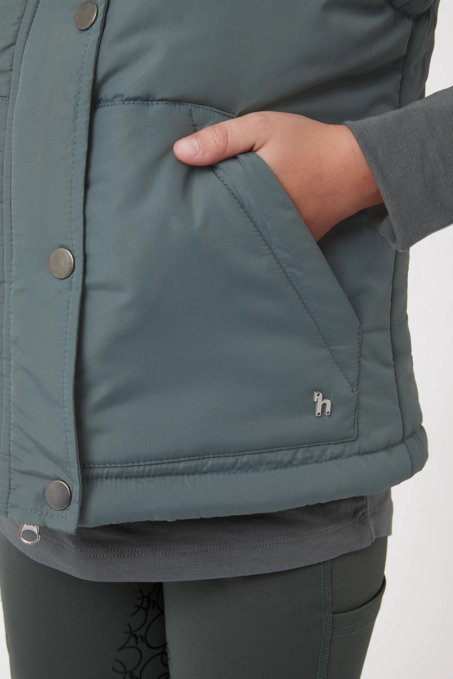 The Horze Leighton teens riding vest is windproof and warm, perfect for your winter rides. Water repellent fabric also keeps you dry. The detachable hood adds extra warmth, and two pockets keep your belongings safe. Stylish colours are easy to incorporate into your winter riding wardrobe. Pair this vest with the rest of our Horze Leighton teens collection for a full look!