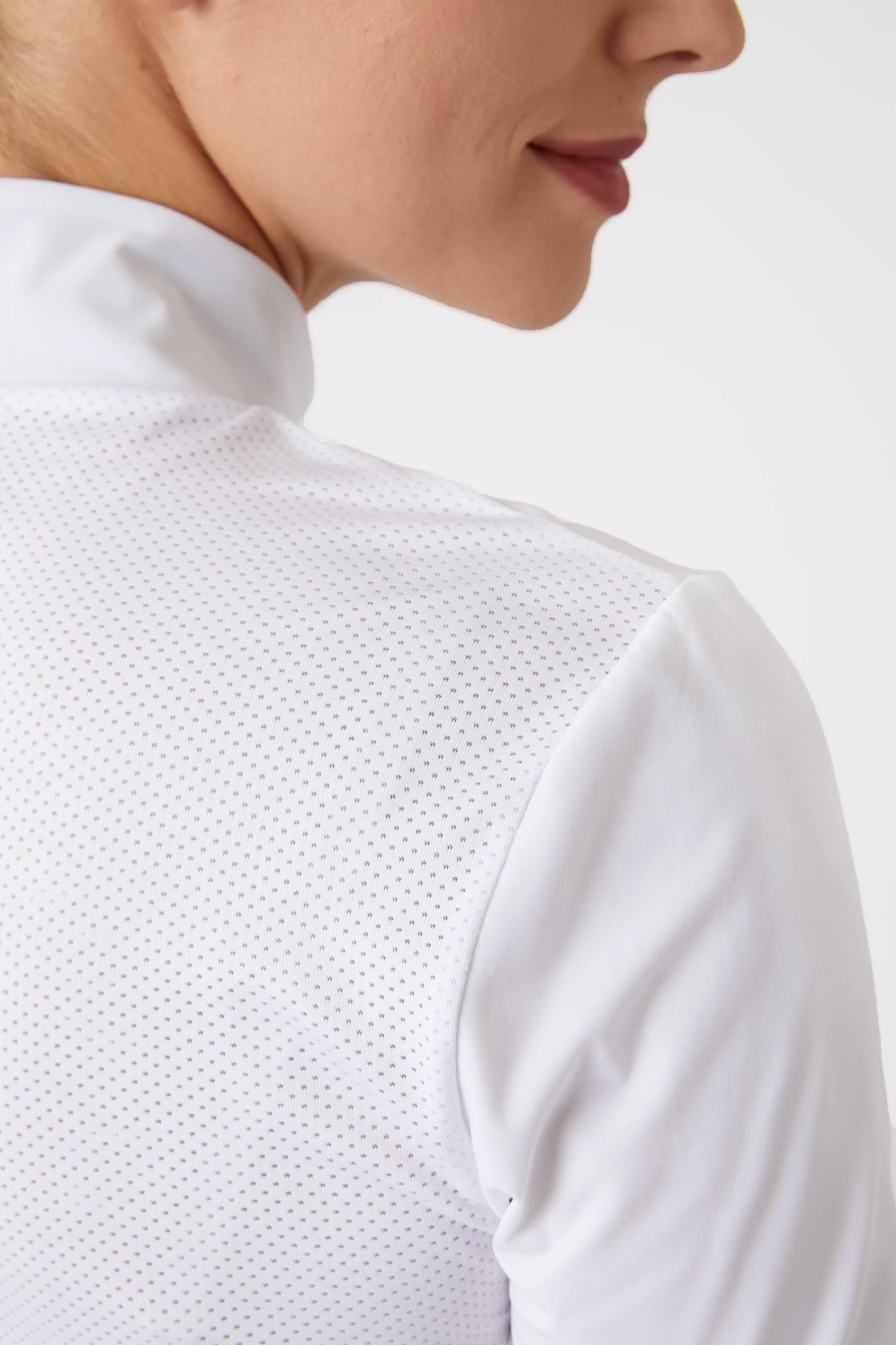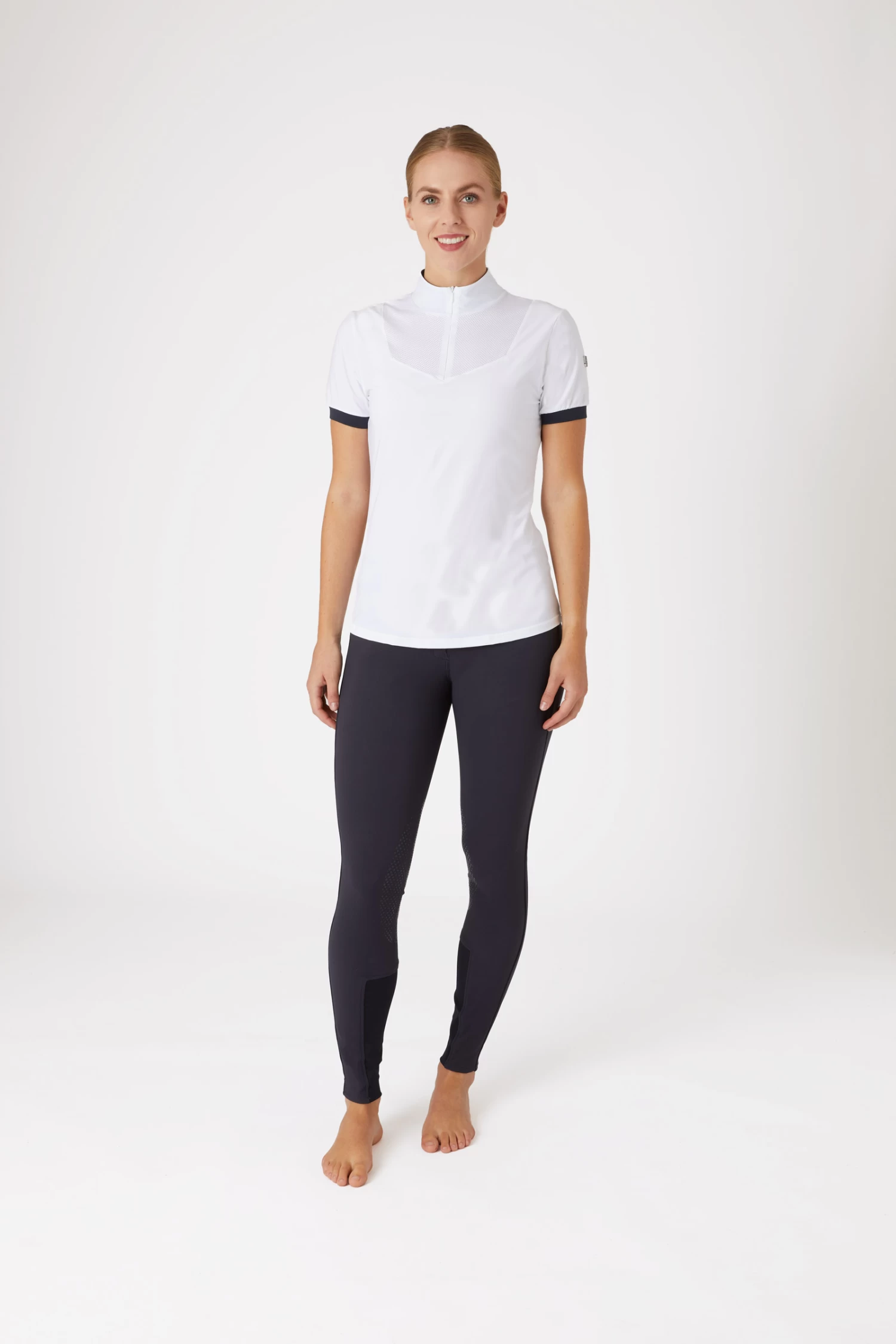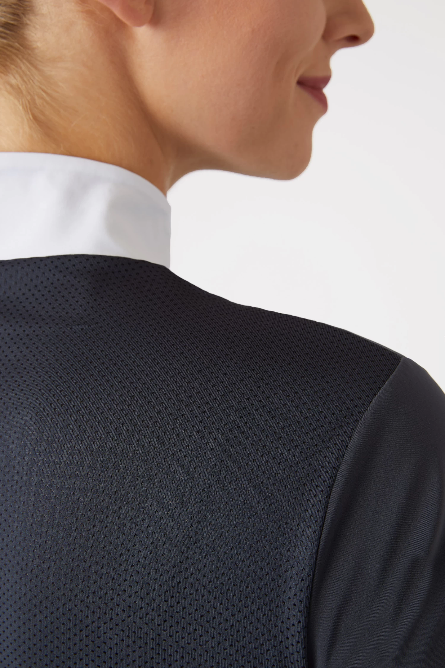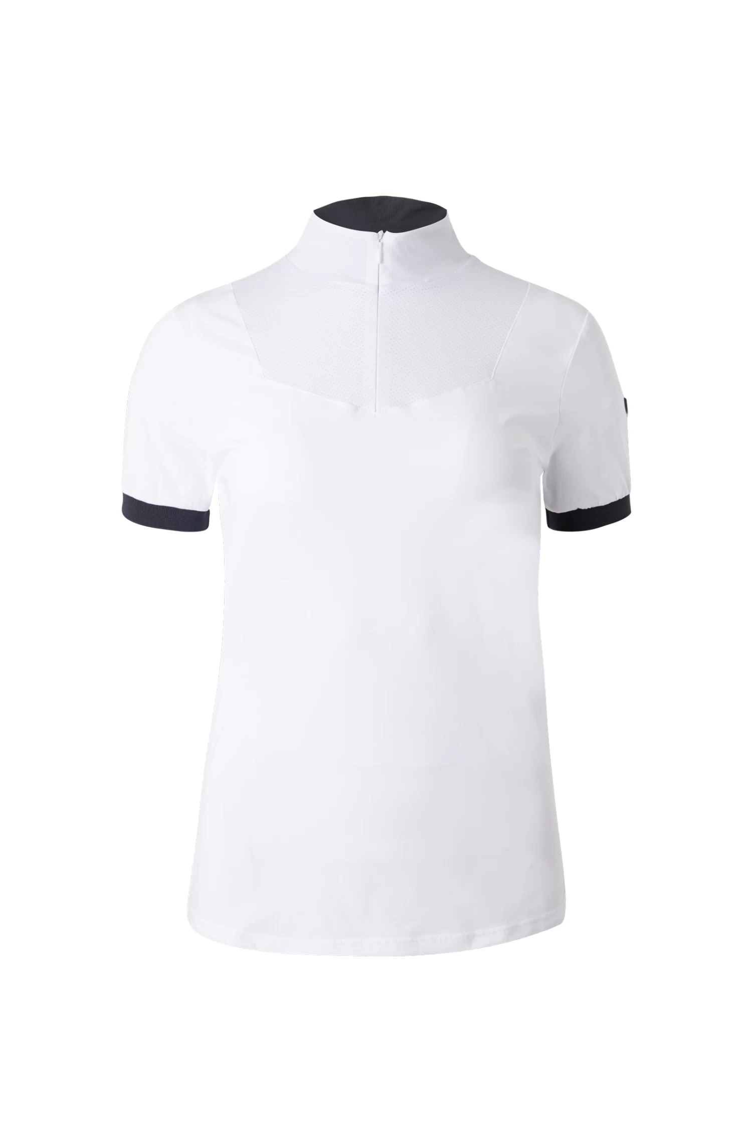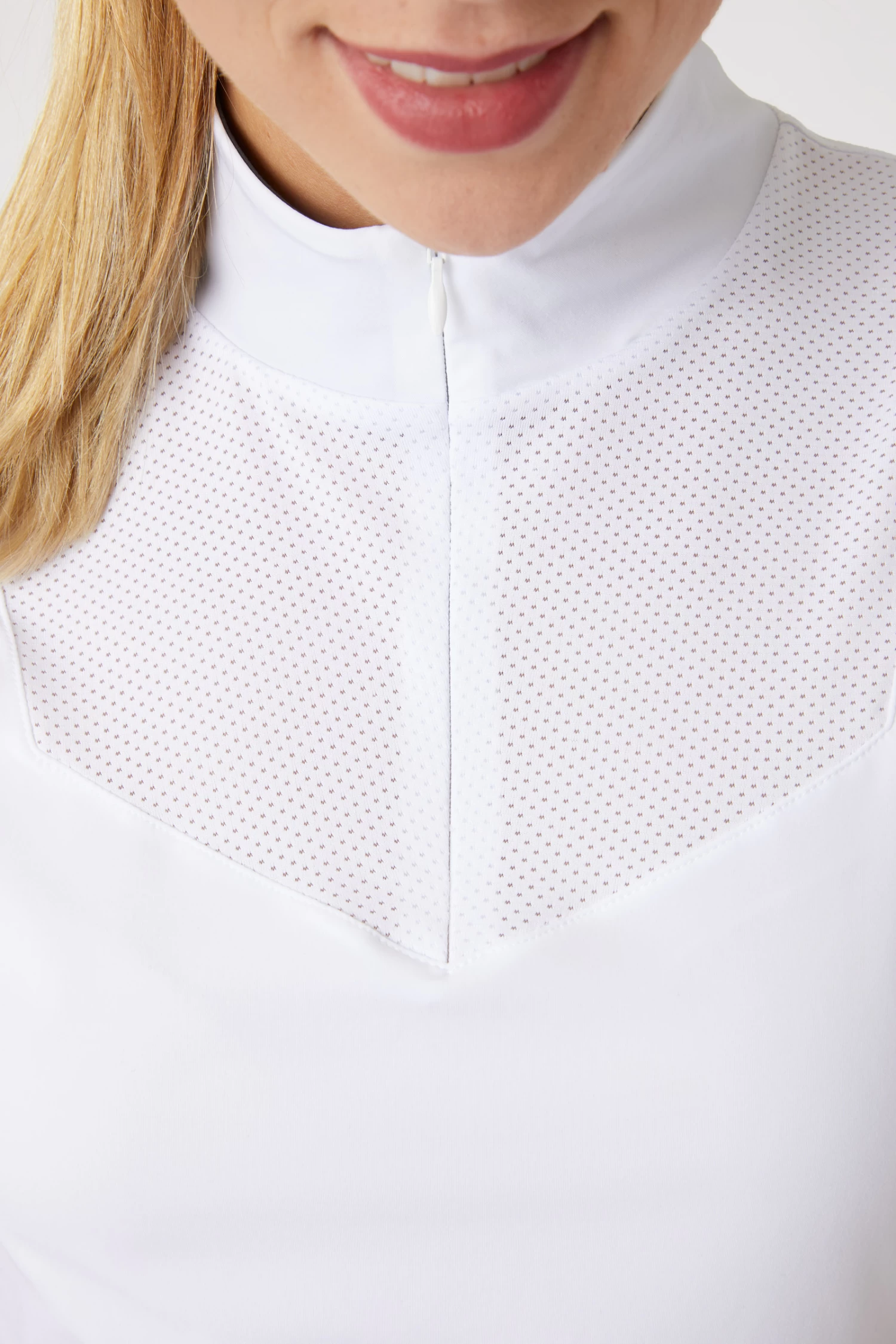 The collar of this beautiful show shirt is ideal for wearing in competition and can also be worn unzipped for casual training. The mesh fabric at chest and back allows additional airflow and ultimate functionality. The zipper is easy to use and allows for a quick change. The shape is sporty yet feminine, perfect for a variety of uses. The fabric is soft yet durable, making it ideal for active riders.