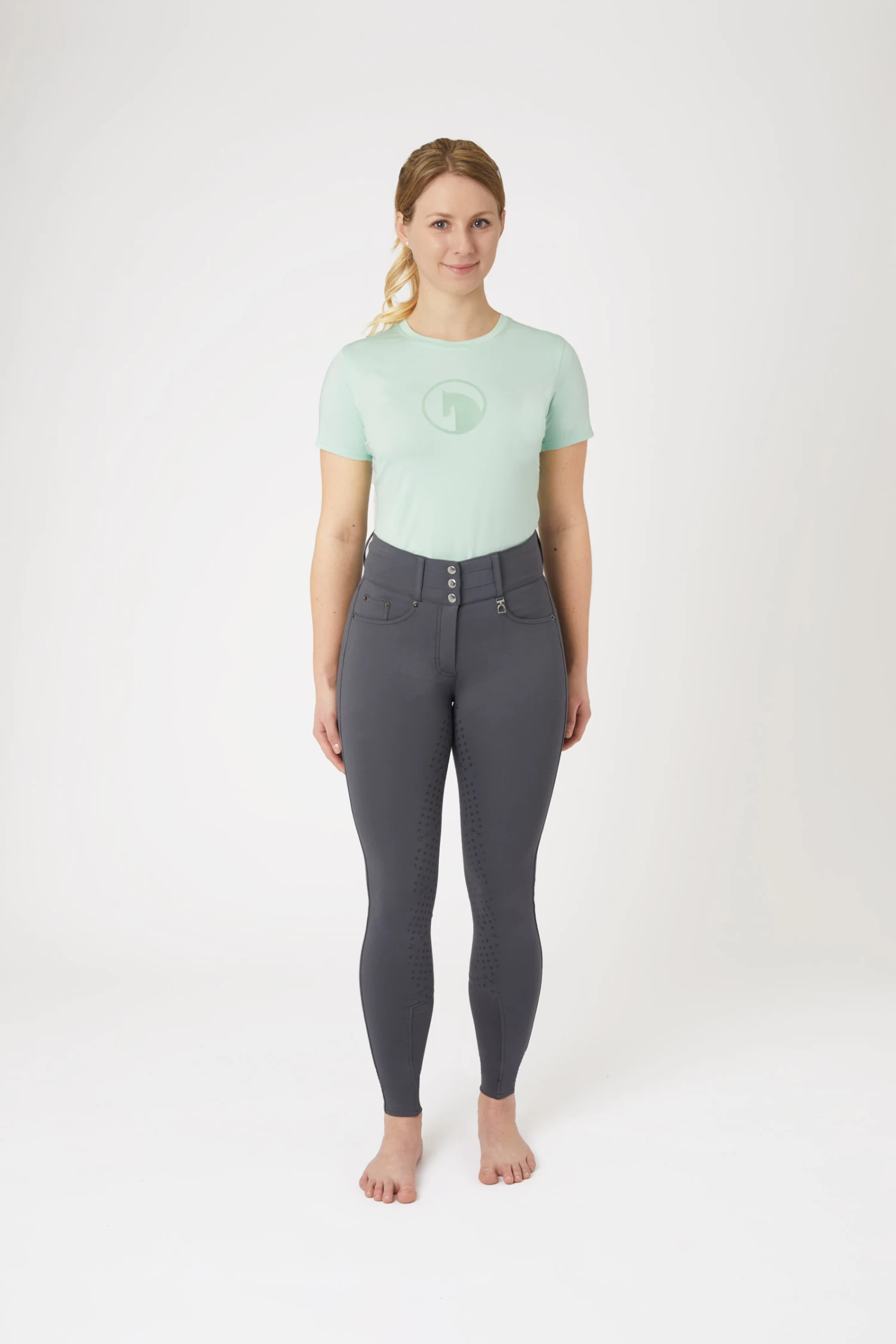 Starting of with a slights higher cut at the back to provide optimal coverage even while in the saddle, while the back seams create a beautiful feminine silhouette. Furthermore, the left off silicon grip at the seat allows for more flexibility in the saddle, while the full grip still provides more grip compared to mere knee grip breeches. The wide waistband of these high waist breeches is super comfortable to wear and can still be combined with a belt of you choice thanks to the belt loops. The front closure with three gutos buttons are adorned with small ‘h’ logos. Several front and back pockets for stowing away small things or your phone. The stretchy breathable material makes these breeches a üerfect choice for every season.