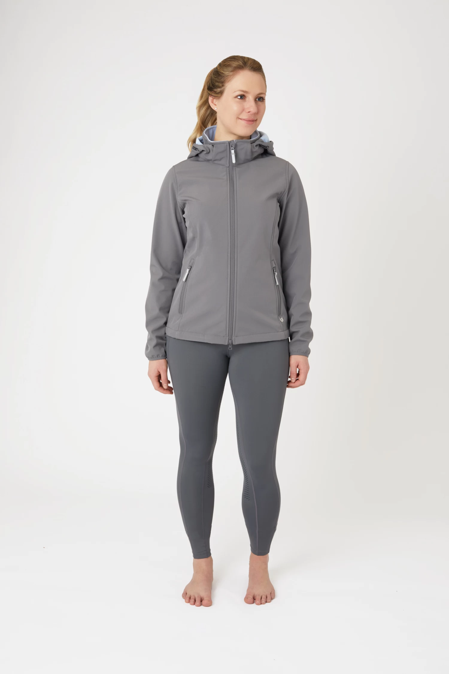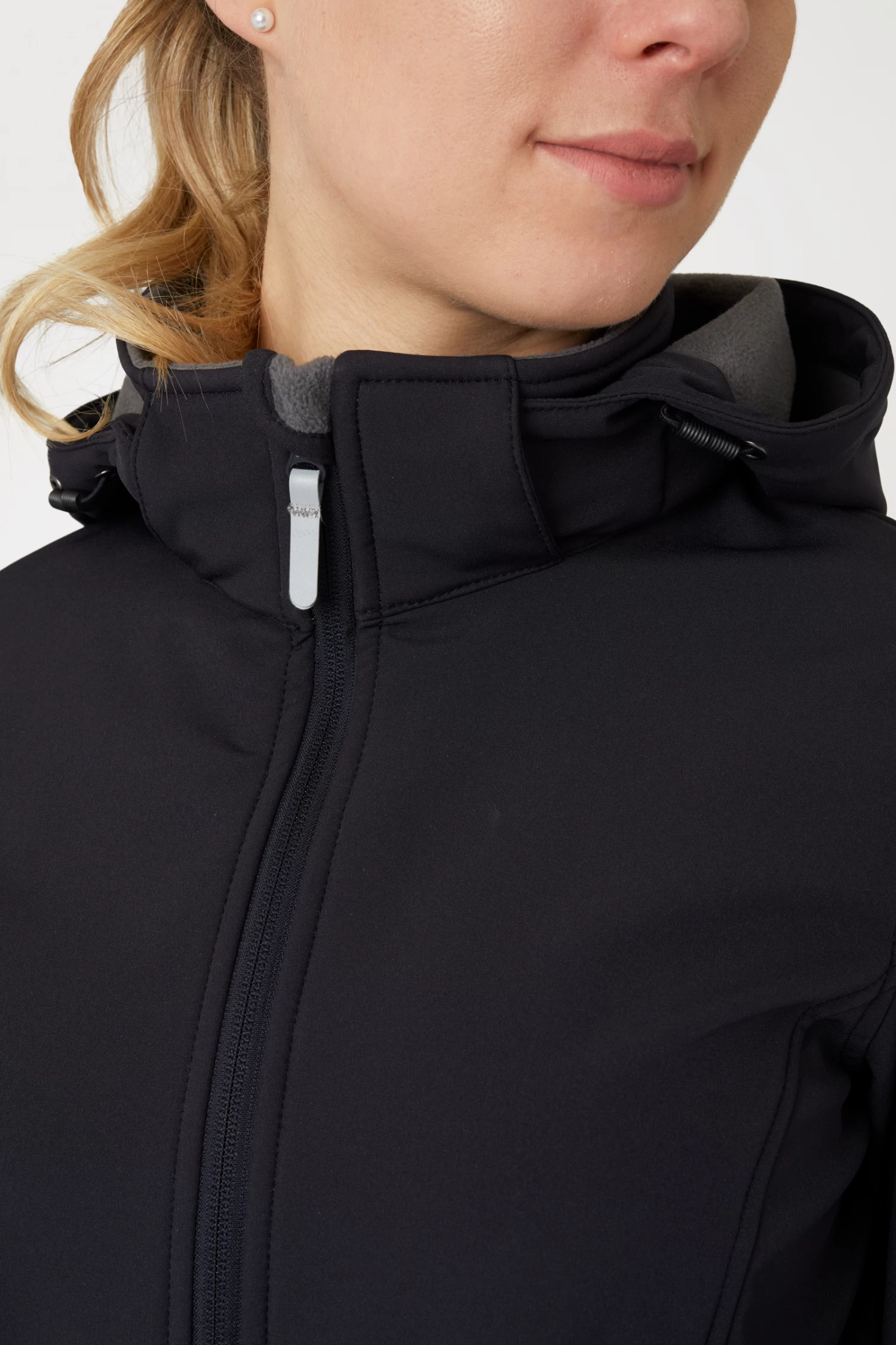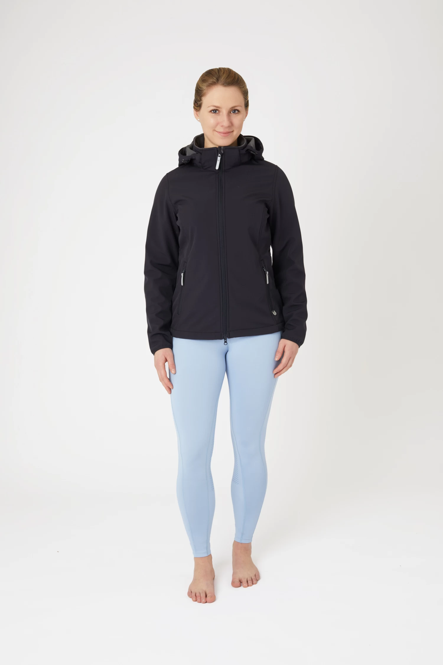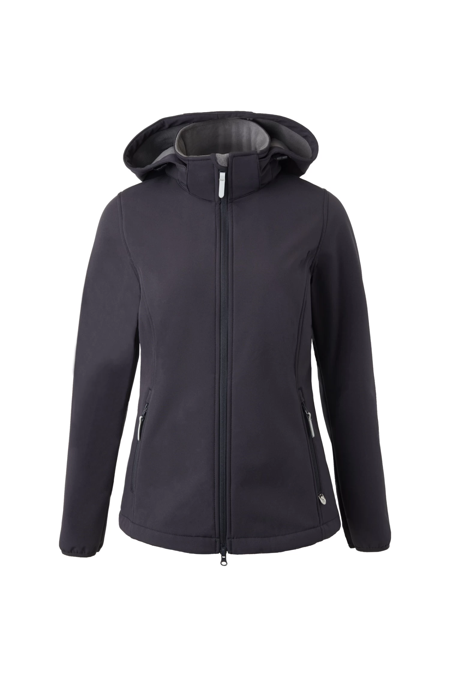 This functional women’s softshell jacket with a soft fleece lining in contrasting colour is the perfect option for layering or warmer spring days. It’s also a comfortable companion during short rain showers, thanks to the waterproof fabric and the hood (which can also be detached with a zipper). The two-way front zip make the jacket perfectly suitable for rinding and the spacious zipper pocktes allow you to stow away keys or your phone while being at the stables. The drawstring inside the back waist panel creates a flattering figure if tightened.