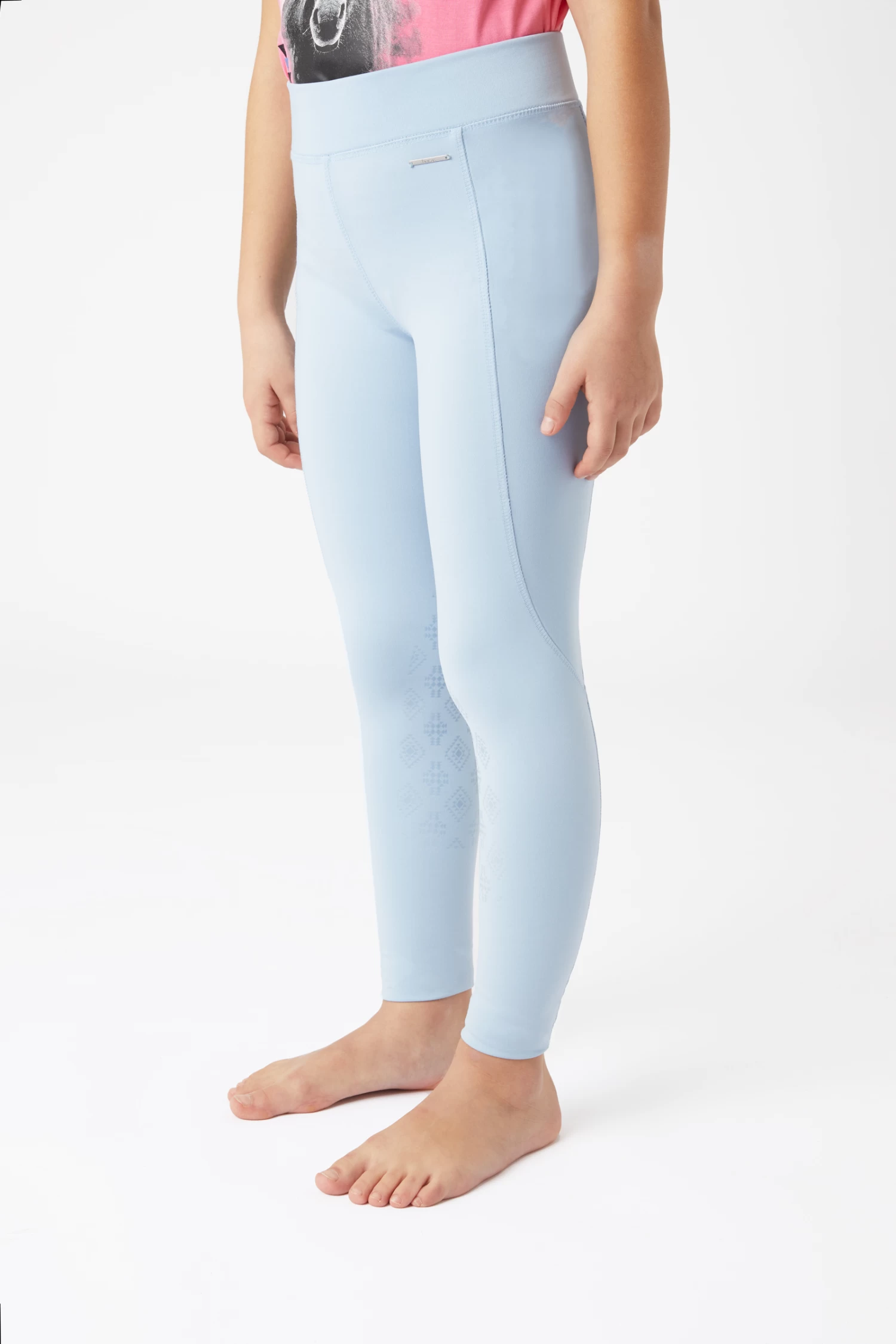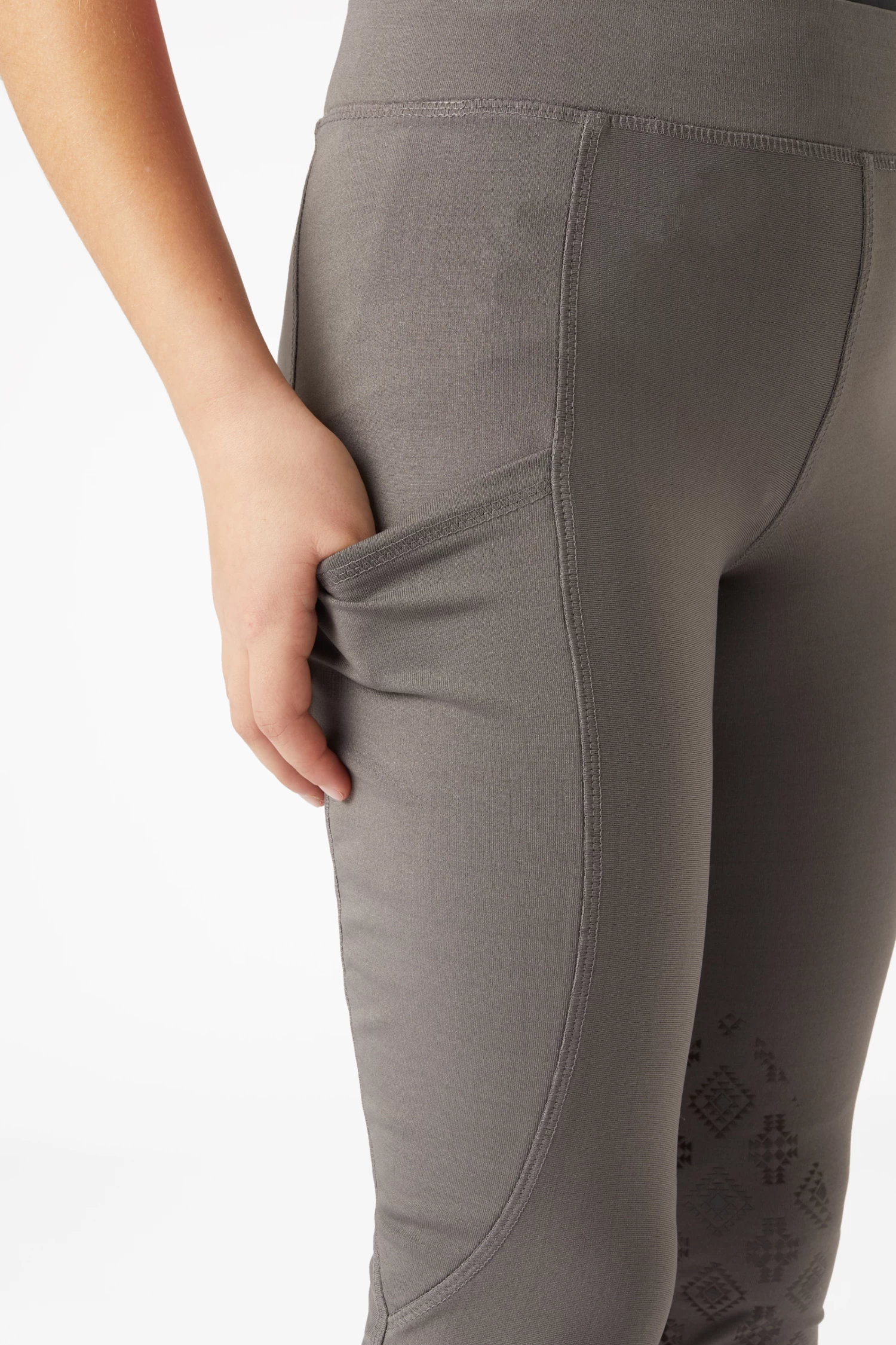 A classic pair of kids’ riding tights made of soft stretchable fabric for wearing comfort. The knee grip features a delicate Aztec print pattern. On the left thigh a large pocket offers room for your kid’s phone. A small logo metal charm can be found on the left front below the waistband.