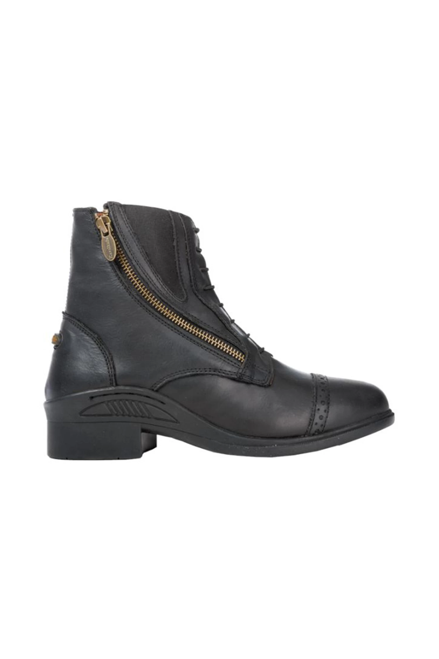 Made of especially robust naturally tanned oiled cow leather, therefore very durable and easy to clean. The specially developed sides provide the highest wearing comfort. Lacing in the front, a curved zipper on the sides in elegant brass with branded zipper. Fits particularly well to the ankle thanks to the elastic inserts on both sides. Loop at the back for easy access. With spur holder. The high-quality insole ensures optimum pressure distribution in the footbed and is also breathable for comfortable wearing. The robust non-slip rubber sole is very flexible, allows anatomical rolling and is therefore gentle on the joints.
