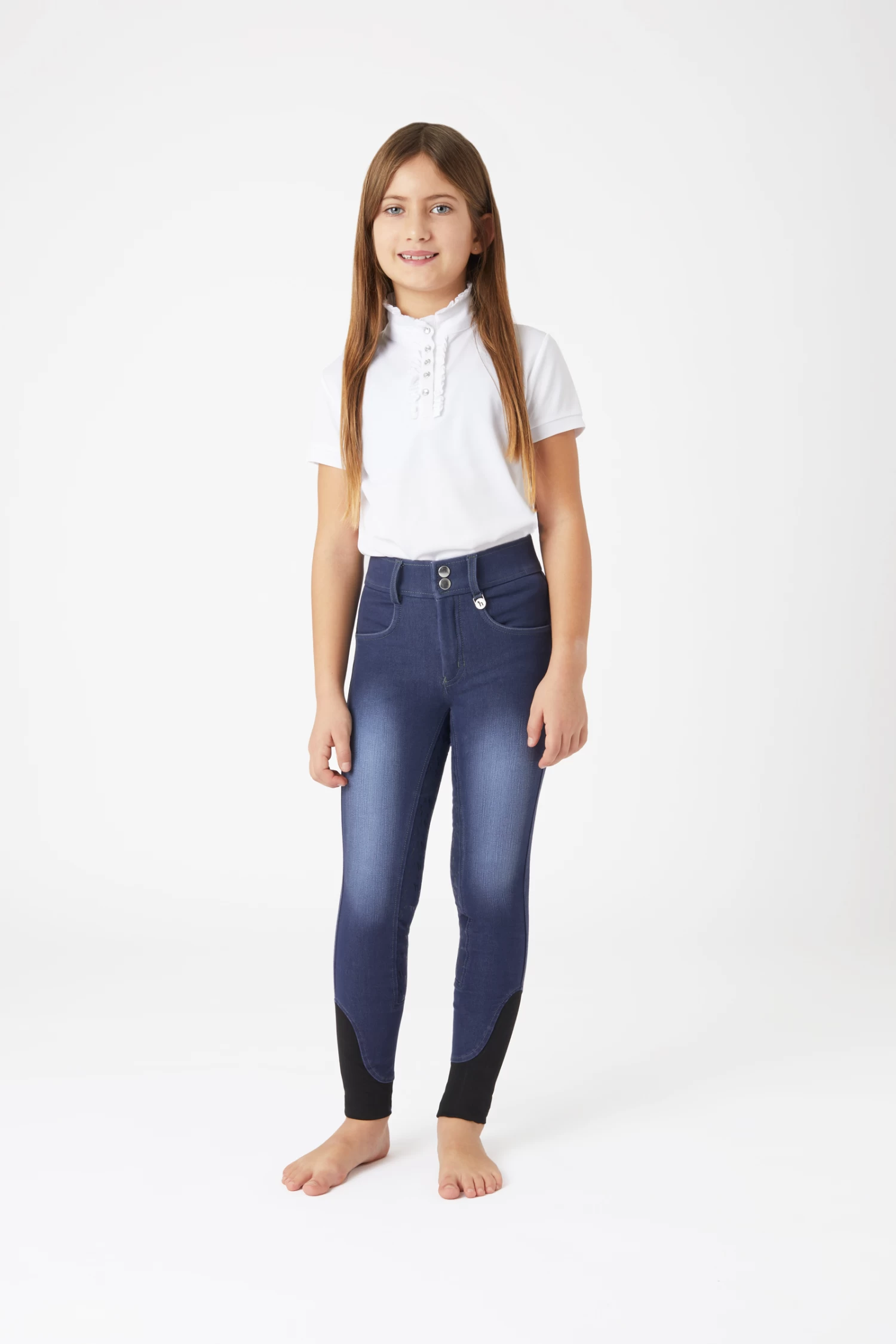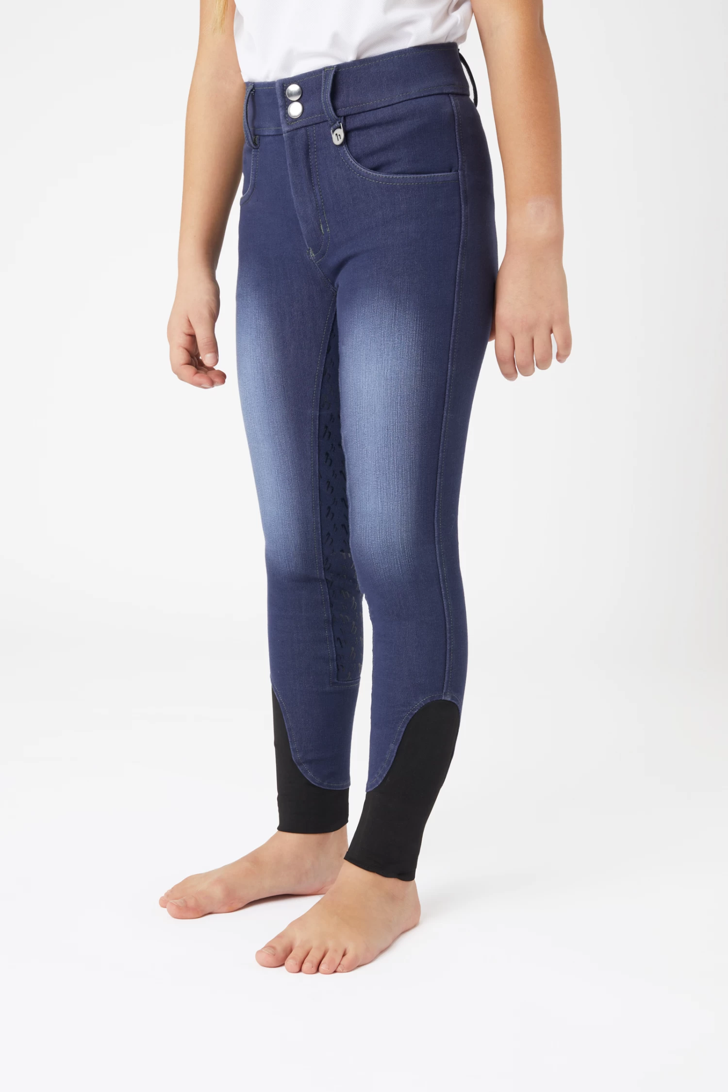 These kids’ denim breeches with silicone full grip provide you with comfort and support in the saddle while looking trendy. Dark blue denim with washing and constrasting gold stitching. A real eye-catcher in the stable! To provide you with extra comfort when wearing boots the leg cuffs are made of black elastic.
