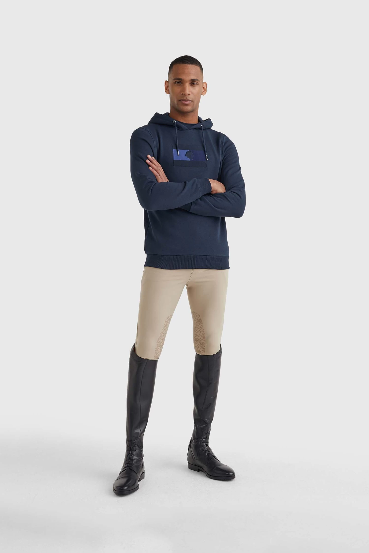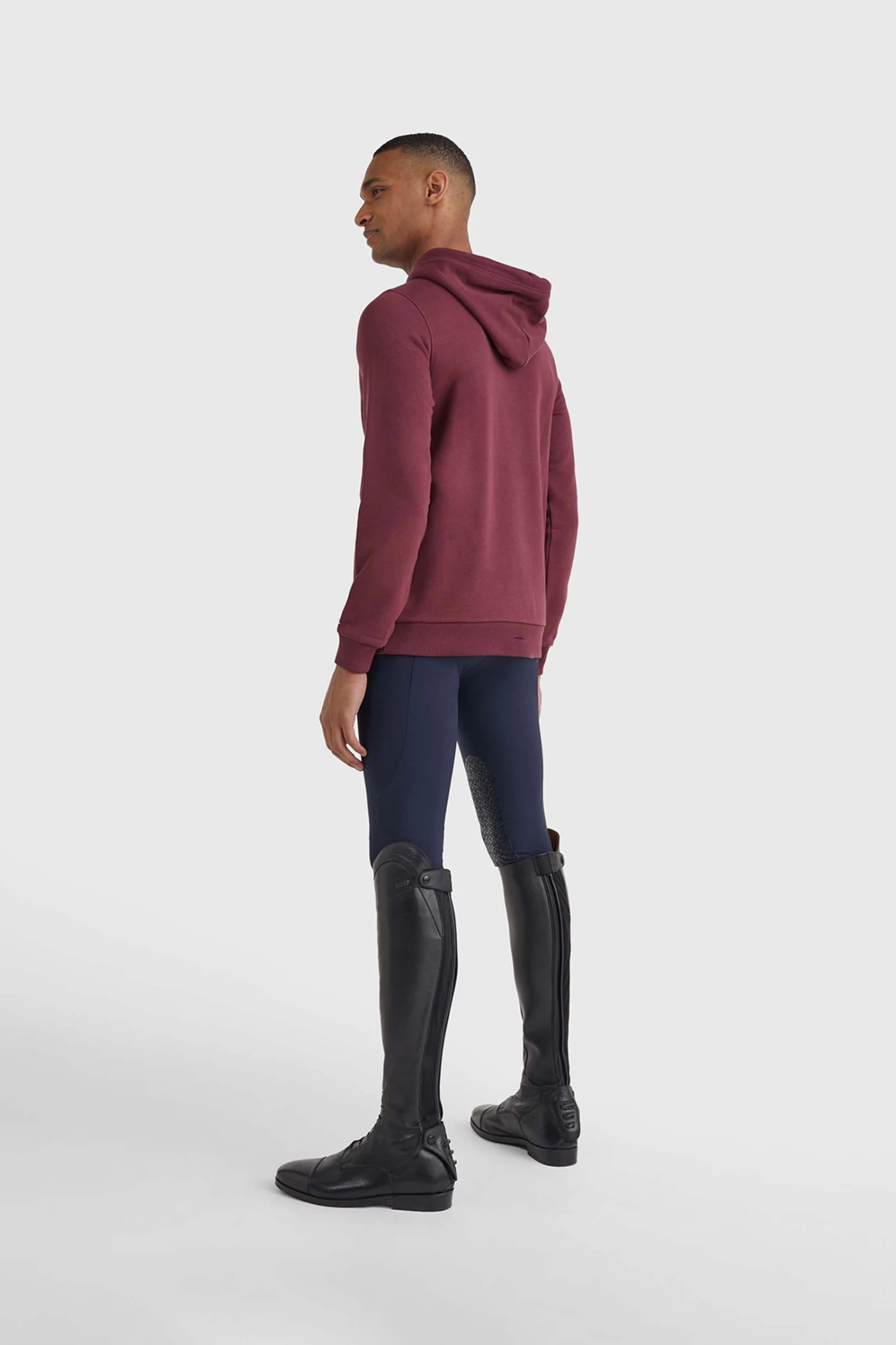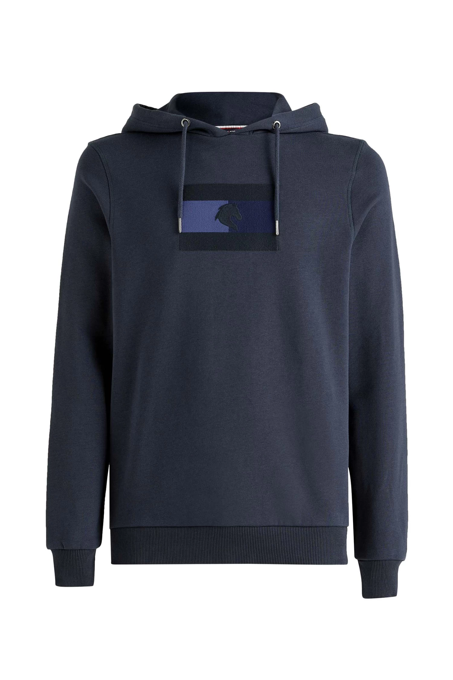 Hoodie from Tommy Hilfiger with drawstring and metal cord ends. He has ribbed cuffs at the hem and cuffs. In addition, the sweater has a large logo embroidery ton in ton centered on the chest and a small logo embroidery on the left sleeve end.