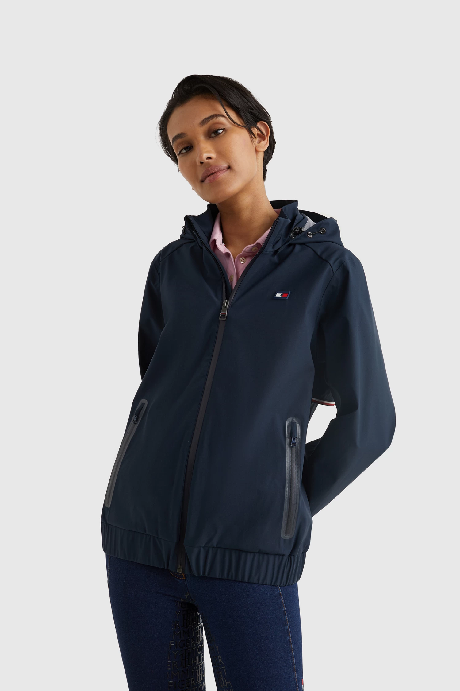 Performance rain jacket in a bomber style with an elastic waistband and air vent on the back. Features a detachable hood, waterproof two-tone 2-way zip on the front and side pockets, tonal adjustable Velcro fasteners on the cuffs, silicon label on the left chest and TH Global Stripe edging across the back. The jacket is WP10000mm, MP 10000g/m2/24h, all critical seams are welded and is made from a waterproof, breathable, 3-layer laminate elastic material that stretches in all 4 directions.